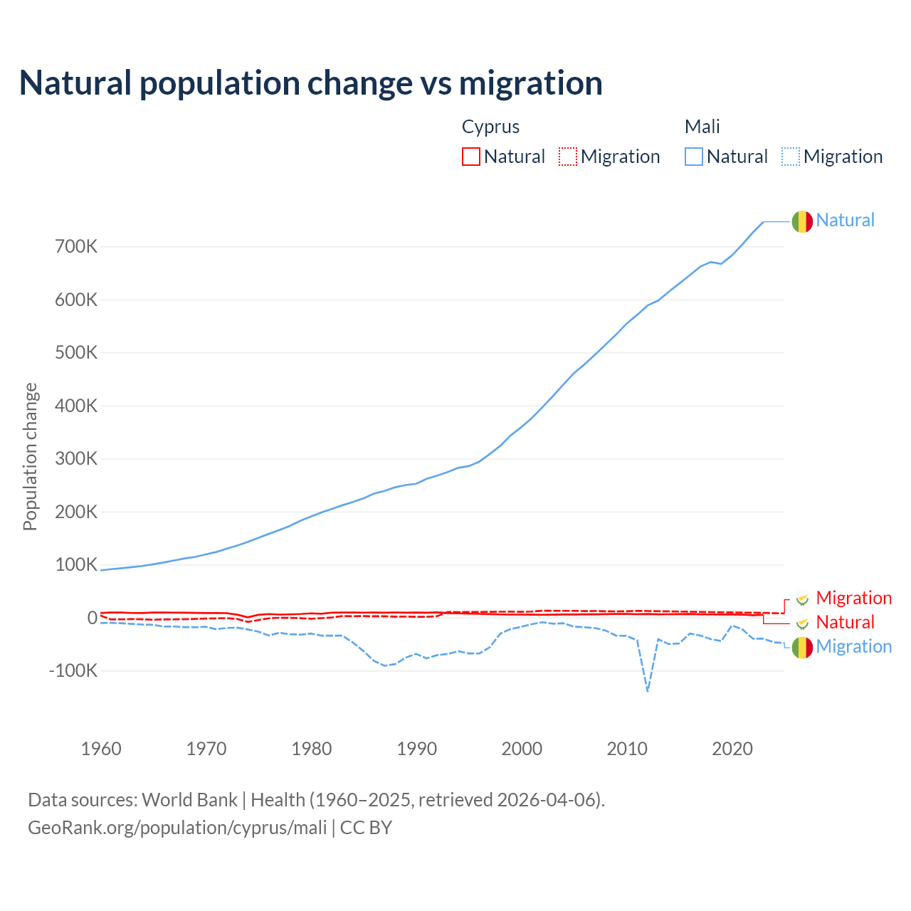 Over the last 10 years, 36.2% of the population change in Cyprus is from natural causes (a gain of 57,464 people) and 63.8% is from migration (a gain of 101,458 people). In Mali 94.9% is from natural causes (a gain of 6,749,473 people) and 5.13% is from migration (a loss of 365,292 people).