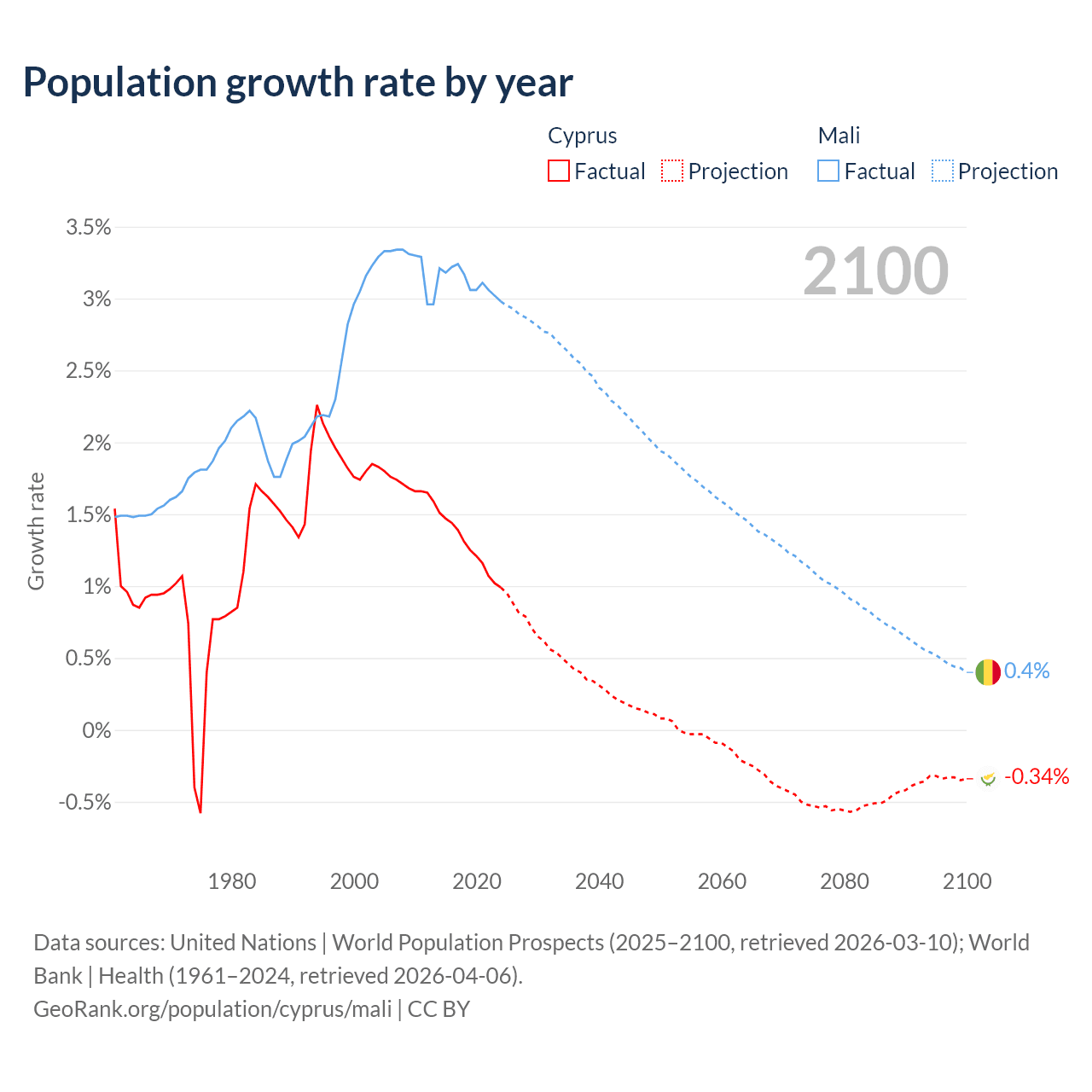 - For the last 10 years, Cyprus has had an average growth rate of +1.26% per year vs +3.12% in Mali.