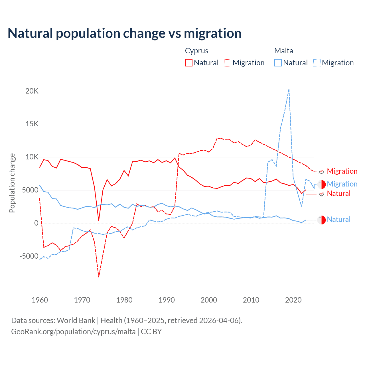 Over the last 10 years, 36.2% of the population change in Cyprus is from natural causes (a gain of 57,464 people) and 63.8% is from migration (a gain of 101,458 people). In Malta 5.84% is from natural causes (a gain of 6,181 people) and 94.2% is from migration (a gain of 99,652 people).
