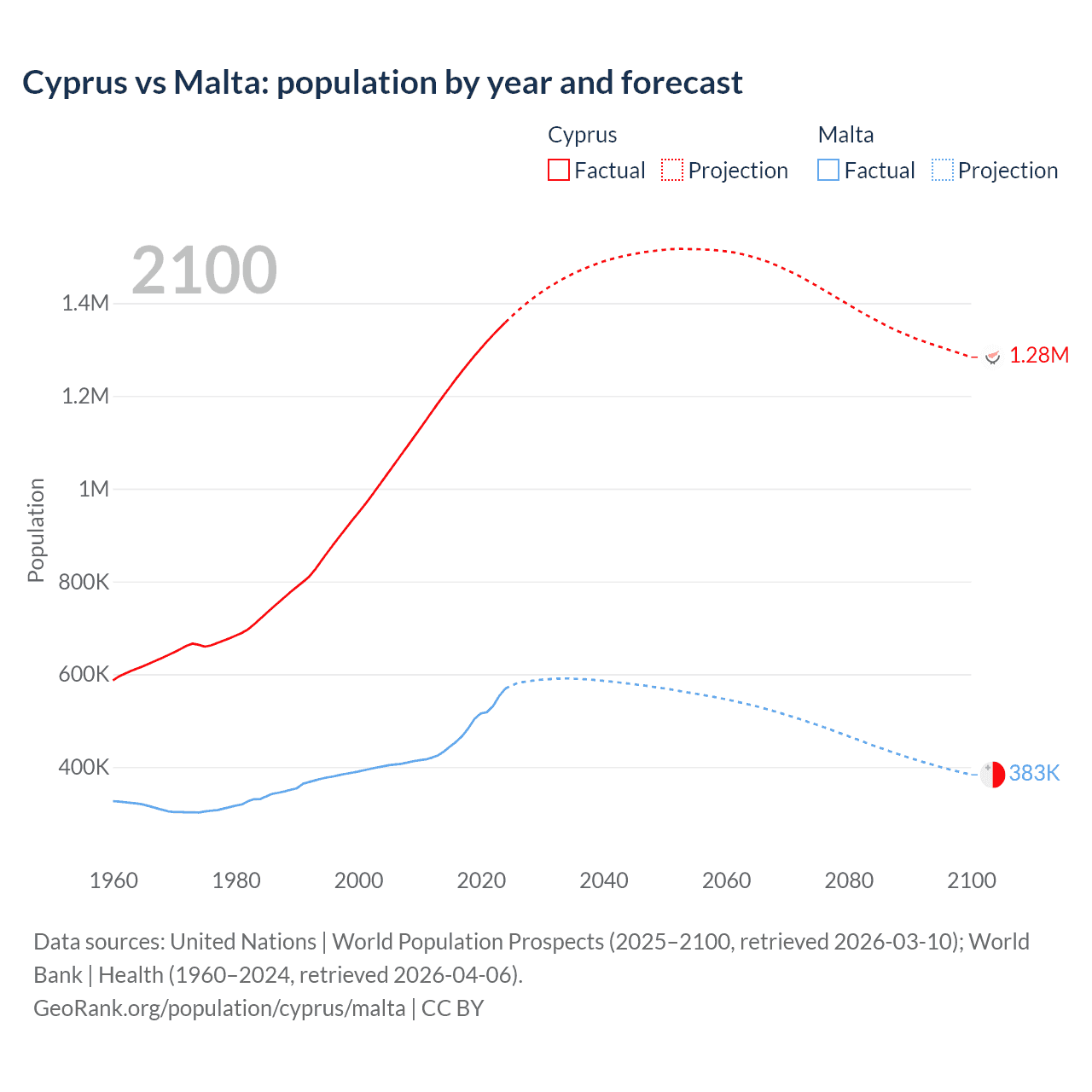 The latest officially reported population of Cyprus was 1,358,282 in 2024 vs 568,847 people in Malta in 2024. In 2026, based on the adjusted UN estimation, the current Cyprus' population is 1,386,362 people compared to 581,729 in Malta.