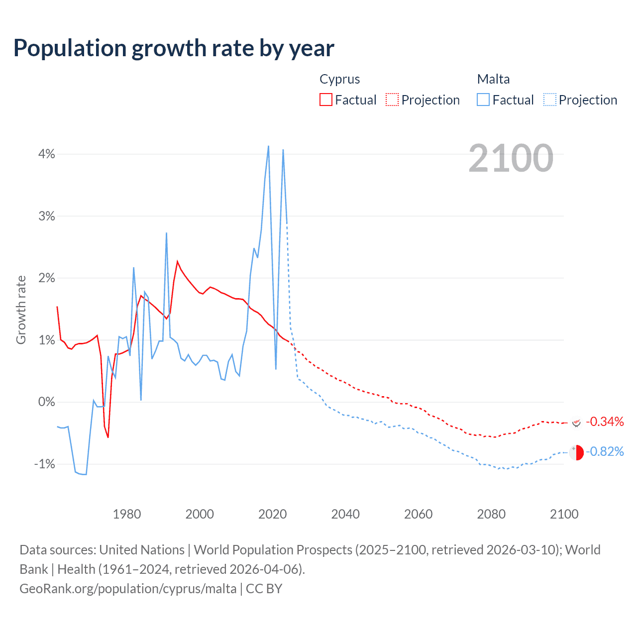 - For the last 10 years, Cyprus has had an average growth rate of +1.26% per year vs +2.69% in Malta.