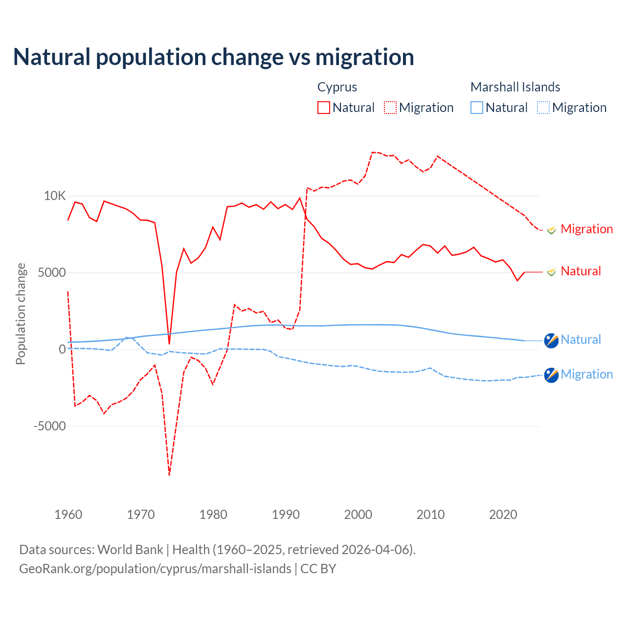 Over the last 10 years, 36.2% of the population change in Cyprus is from natural causes (a gain of 57,464 people) and 63.8% is from migration (a gain of 101,458 people). In the Marshall Islands 27.8% is from natural causes (a gain of 7,592 people) and 72.2% is from migration (a loss of 19,682 people).