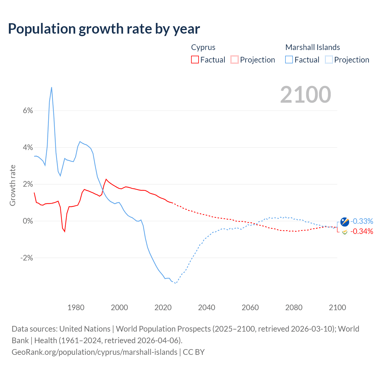 - For the last 10 years, Cyprus has had an average growth rate of +1.26% per year vs -2.69% in the Marshall Islands.