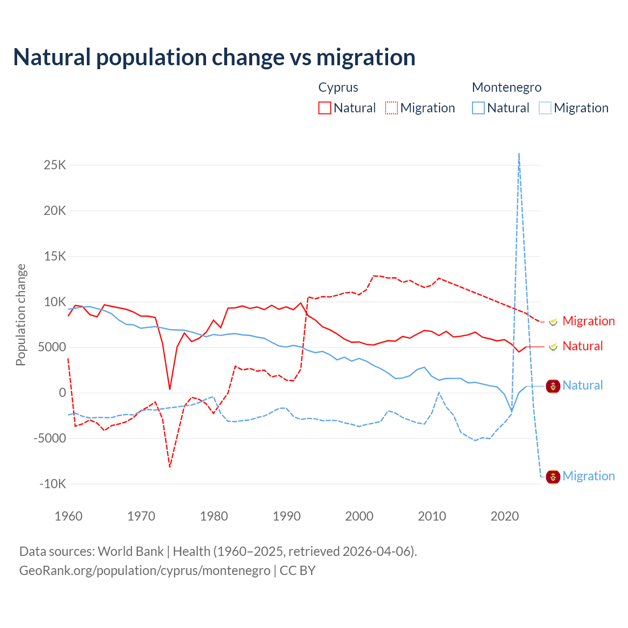 Over the last 10 years, 36.2% of the population change in Cyprus is from natural causes (a gain of 57,464 people) and 63.8% is from migration (a gain of 101,458 people). In Montenegro 52.4% is from natural causes (a gain of 4,501 people) and 47.6% is from migration (a gain of 4,095 people).