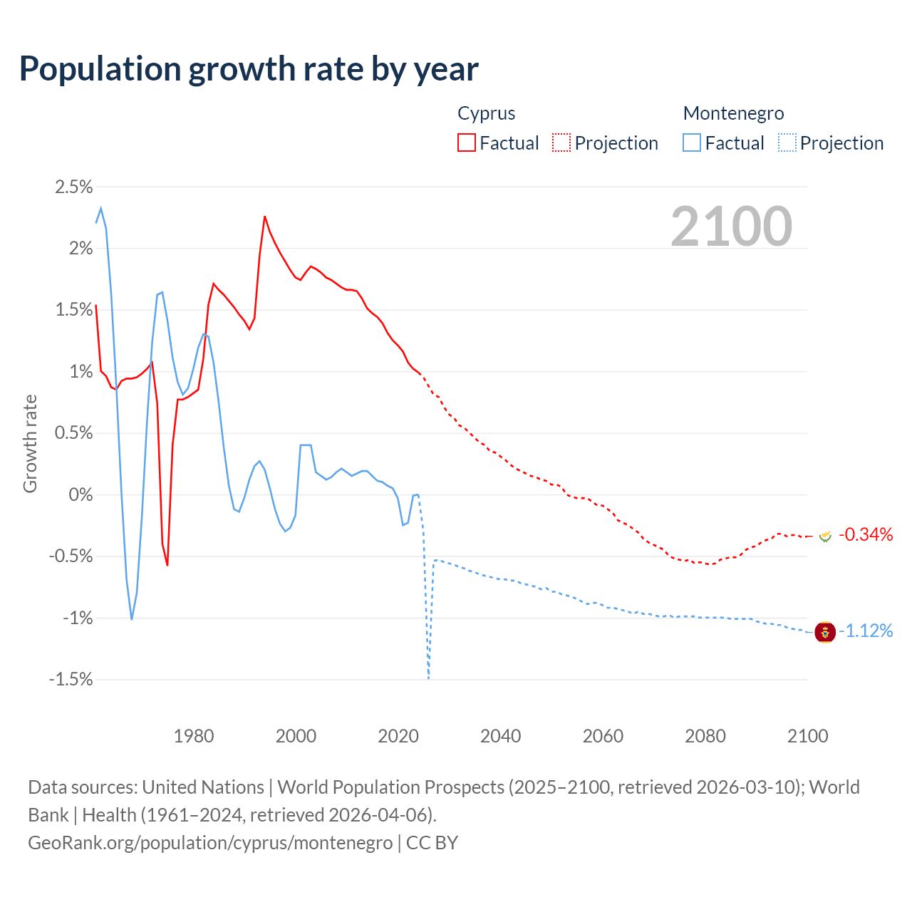 - For the last 10 years, Cyprus has had an average growth rate of +1.26% per year vs +0.01% in Montenegro.