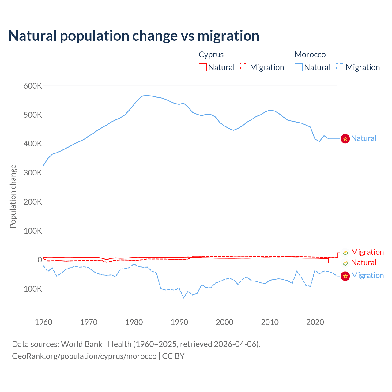 Over the last 10 years, 36.2% of the population change in Cyprus is from natural causes (a gain of 57,464 people) and 63.8% is from migration (a gain of 101,458 people). In Morocco 88.3% is from natural causes (a gain of 4,495,223 people) and 11.7% is from migration (a loss of 594,083 people).