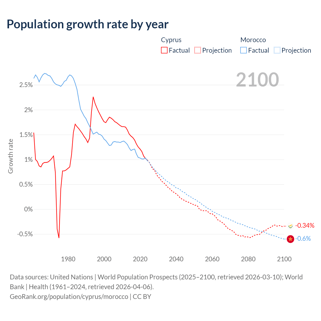 - For the last 10 years, Cyprus has had an average growth rate of +1.26% per year vs +1.09% in Morocco.