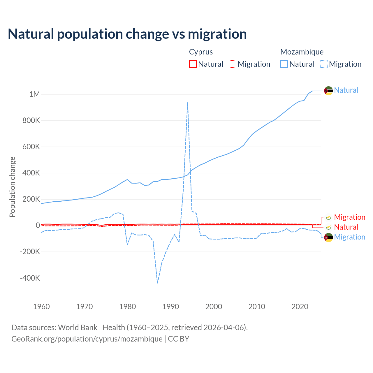 Over the last 10 years, 36.2% of the population change in Cyprus is from natural causes (a gain of 57,464 people) and 63.8% is from migration (a gain of 101,458 people). In Mozambique 95.9% is from natural causes (a gain of 9,108,203 people) and 4.15% is from migration (a loss of 393,923 people).
