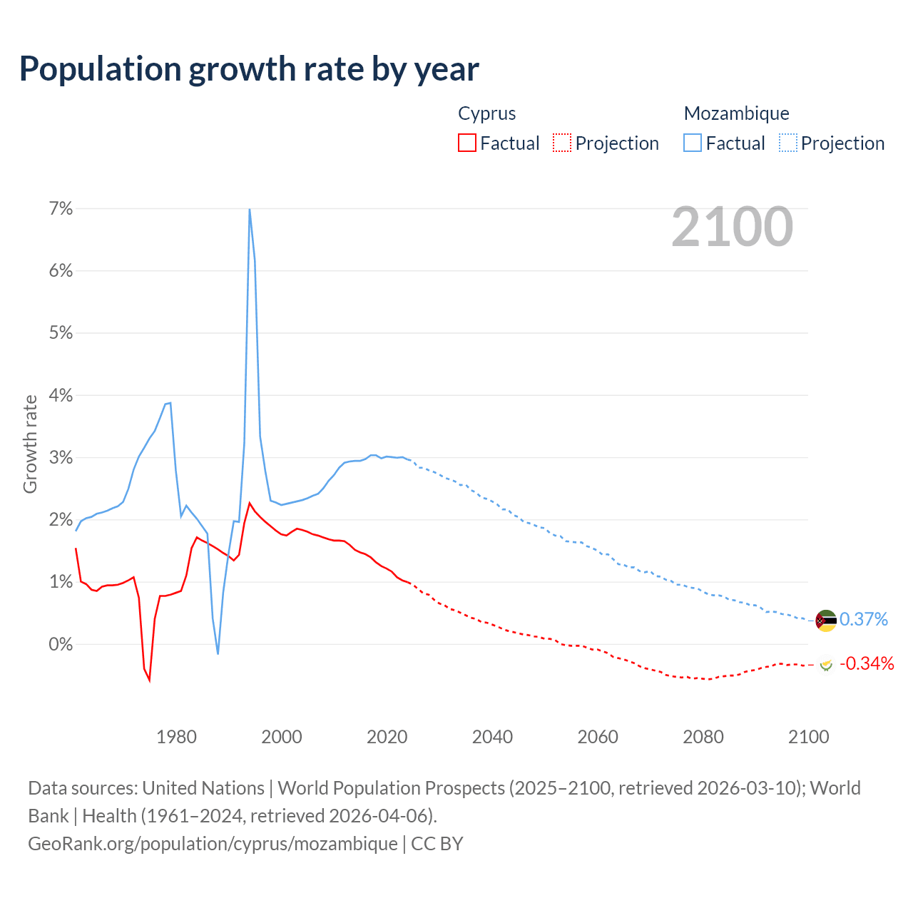 - For the last 10 years, Cyprus has had an average growth rate of +1.26% per year vs +2.99% in Mozambique.