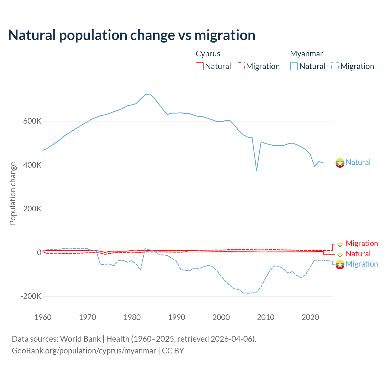Over the last 10 years, 36.2% of the population change in Cyprus is from natural causes (a gain of 57,464 people) and 63.8% is from migration (a gain of 101,458 people). In Myanmar 86% is from natural causes (a gain of 4,594,615 people) and 14% is from migration (a loss of 749,272 people).