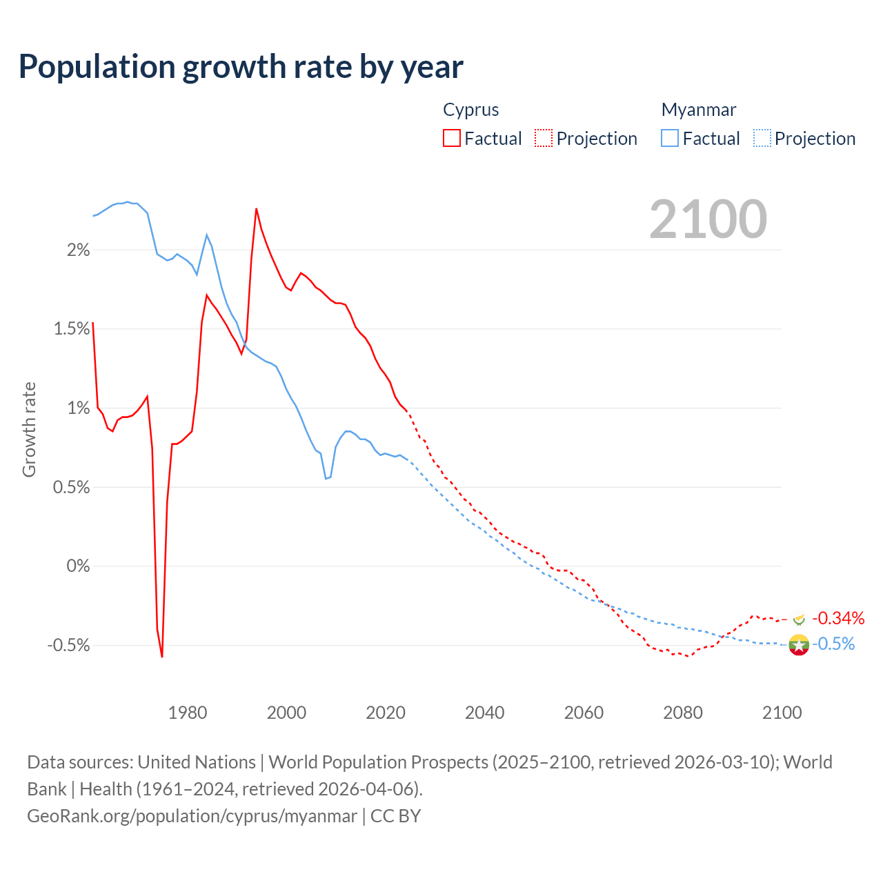 - For the last 10 years, Cyprus has had an average growth rate of +1.26% per year vs +0.74% in Myanmar.