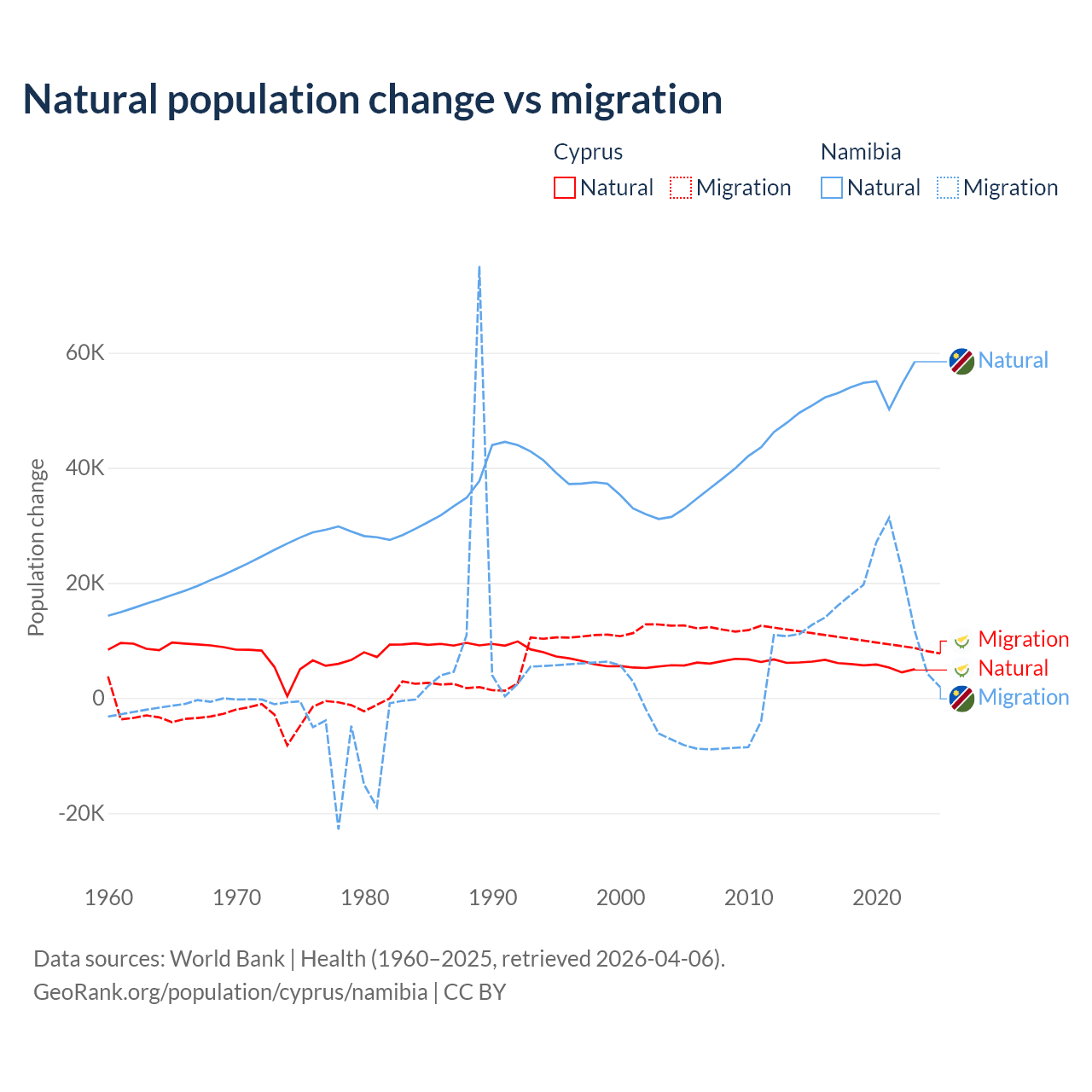 Over the last 10 years, 36.2% of the population change in Cyprus is from natural causes (a gain of 57,464 people) and 63.8% is from migration (a gain of 101,458 people). In Namibia 74.3% is from natural causes (a gain of 532,532 people) and 25.7% is from migration (a gain of 183,837 people).