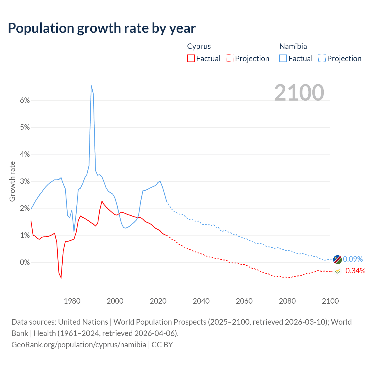 - For the last 10 years, Cyprus has had an average growth rate of +1.26% per year vs +2.73% in Namibia.