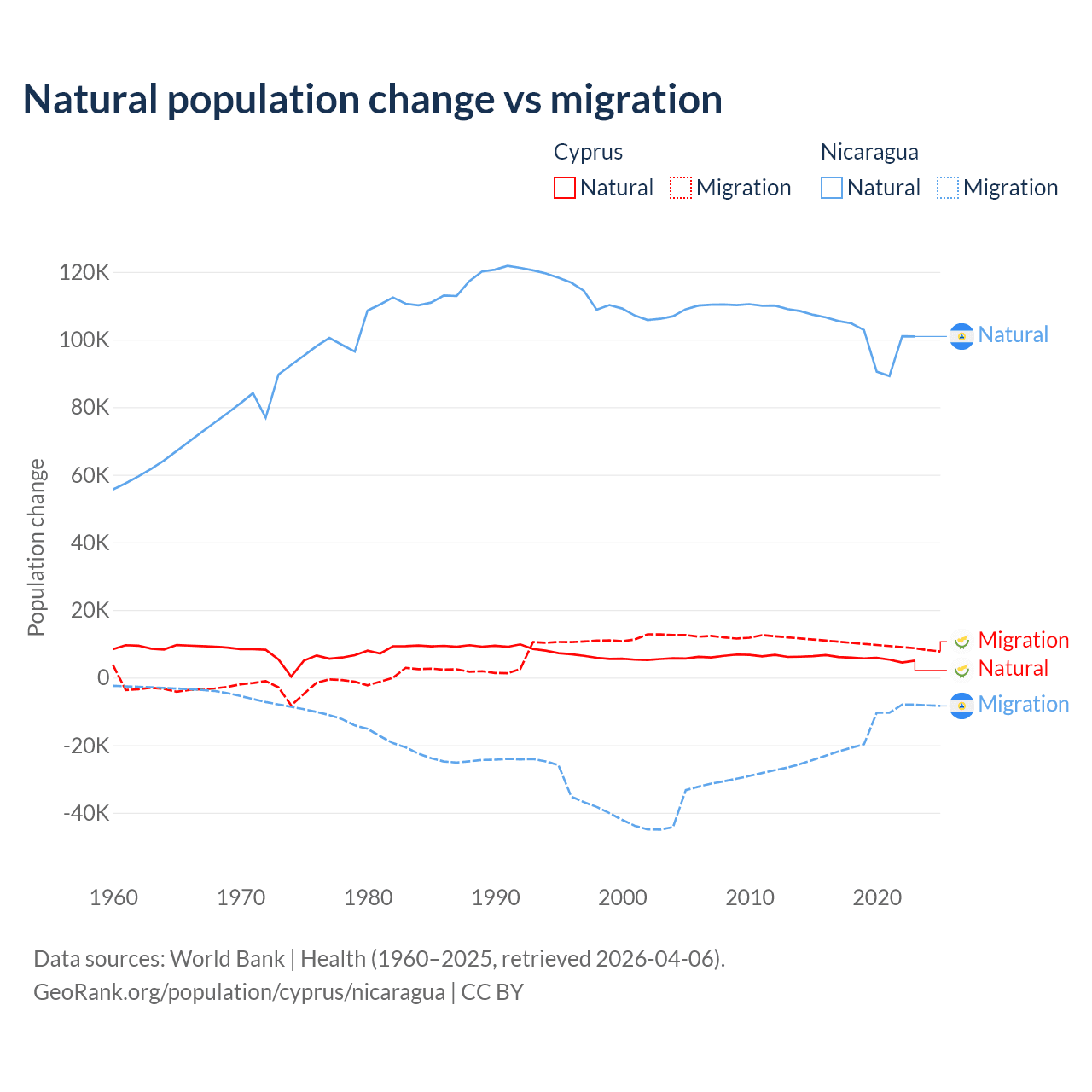 Over the last 10 years, 36.2% of the population change in Cyprus is from natural causes (a gain of 57,464 people) and 63.8% is from migration (a gain of 101,458 people). In Nicaragua 85.5% is from natural causes (a gain of 1,017,084 people) and 14.5% is from migration (a loss of 172,078 people).
