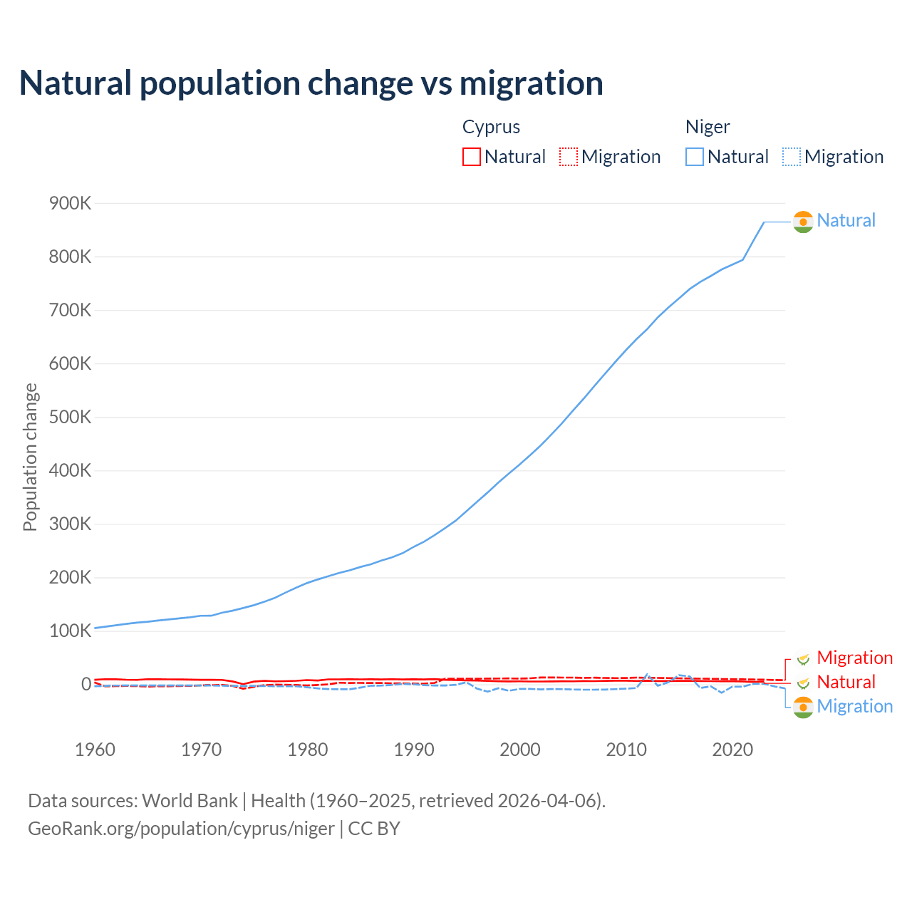 Over the last 10 years, 36.2% of the population change in Cyprus is from natural causes (a gain of 57,464 people) and 63.8% is from migration (a gain of 101,458 people). In Niger 100% is from natural causes (a gain of 7,728,287 people) and 0.03% is from migration (a gain of 2,520 people).