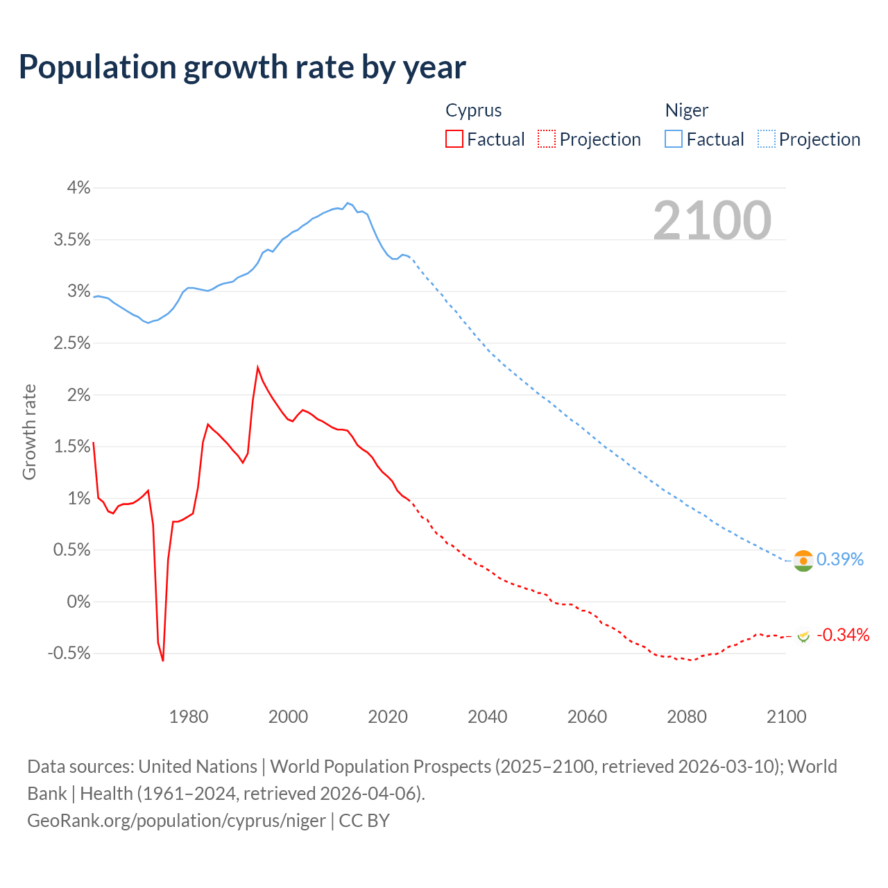 - For the last 10 years, Cyprus has had an average growth rate of +1.26% per year vs +3.5% in Niger.