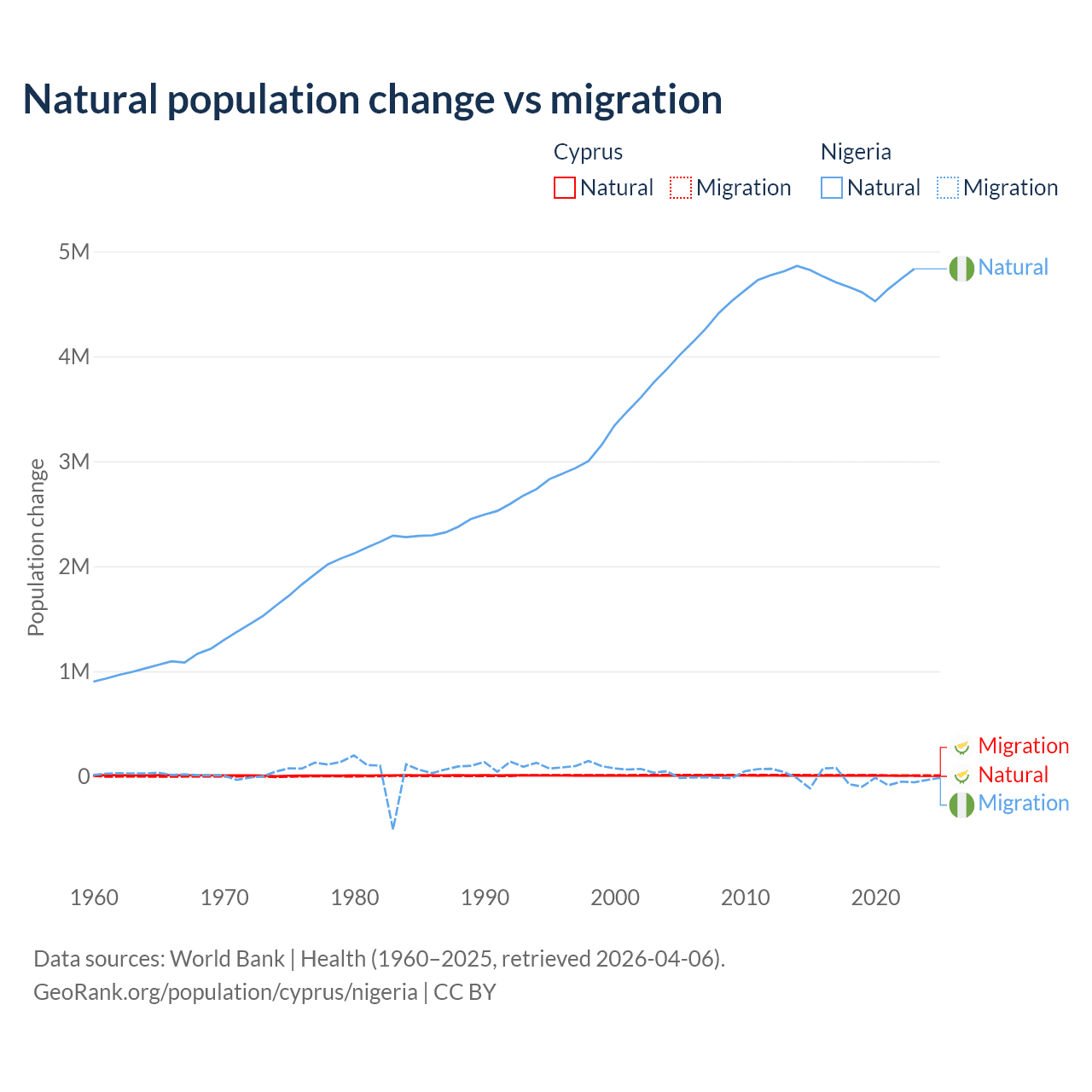 Over the last 10 years, 36.2% of the population change in Cyprus is from natural causes (a gain of 57,464 people) and 63.8% is from migration (a gain of 101,458 people). In Nigeria 99.2% is from natural causes (a gain of 47,163,517 people) and 0.77% is from migration (a loss of 368,103 people).