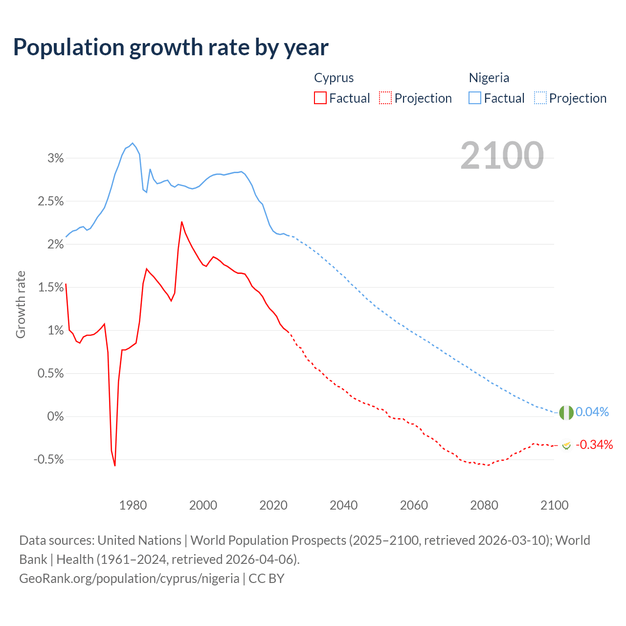 - For the last 10 years, Cyprus has had an average growth rate of +1.26% per year vs +2.31% in Nigeria.