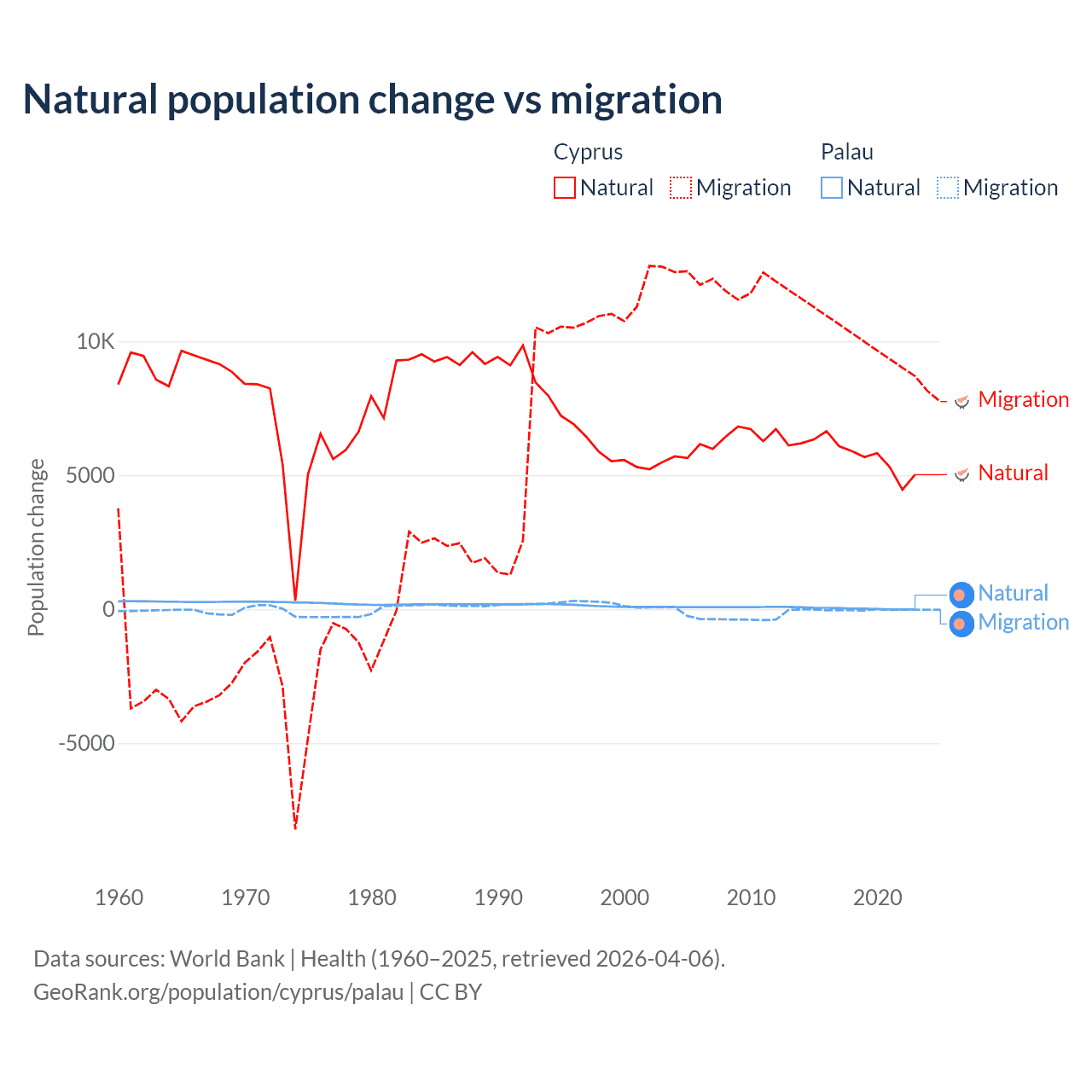 Over the last 10 years, 36.2% of the population change in Cyprus is from natural causes (a gain of 57,464 people) and 63.8% is from migration (a gain of 101,458 people). In Palau 53.8% is from natural causes (a gain of 264 people) and 46.2% is from migration (a loss of 227 people).