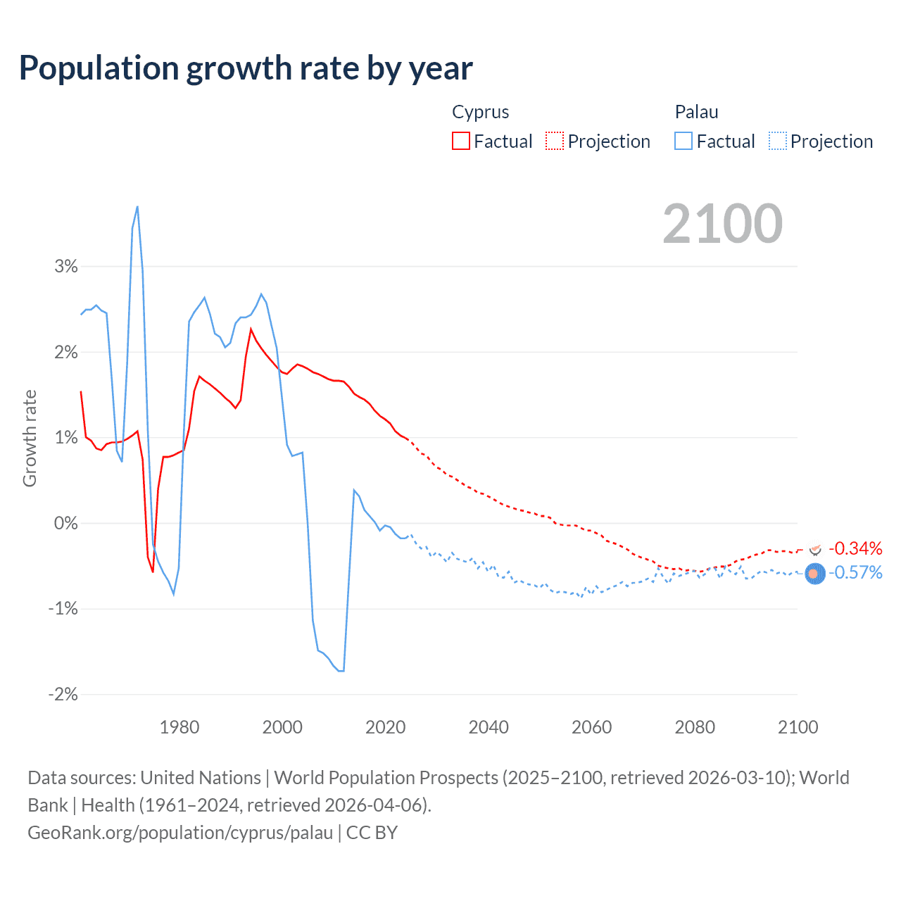 - For the last 10 years, Cyprus has had an average growth rate of +1.26% per year vs +0.02% in Palau.