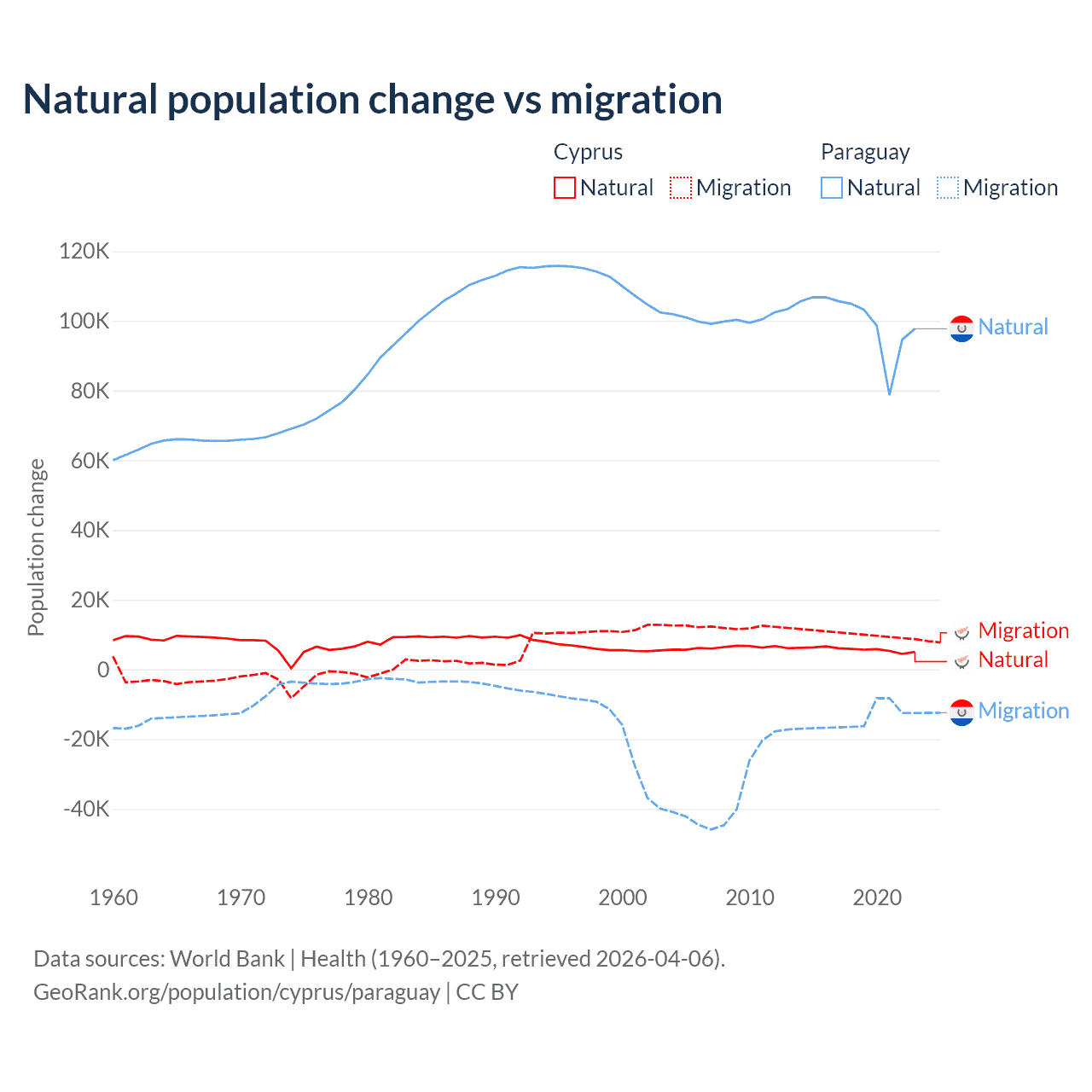 Over the last 10 years, 36.2% of the population change in Cyprus is from natural causes (a gain of 57,464 people) and 63.8% is from migration (a gain of 101,458 people). In Paraguay 87.6% is from natural causes (a gain of 1,002,636 people) and 12.4% is from migration (a loss of 141,377 people).