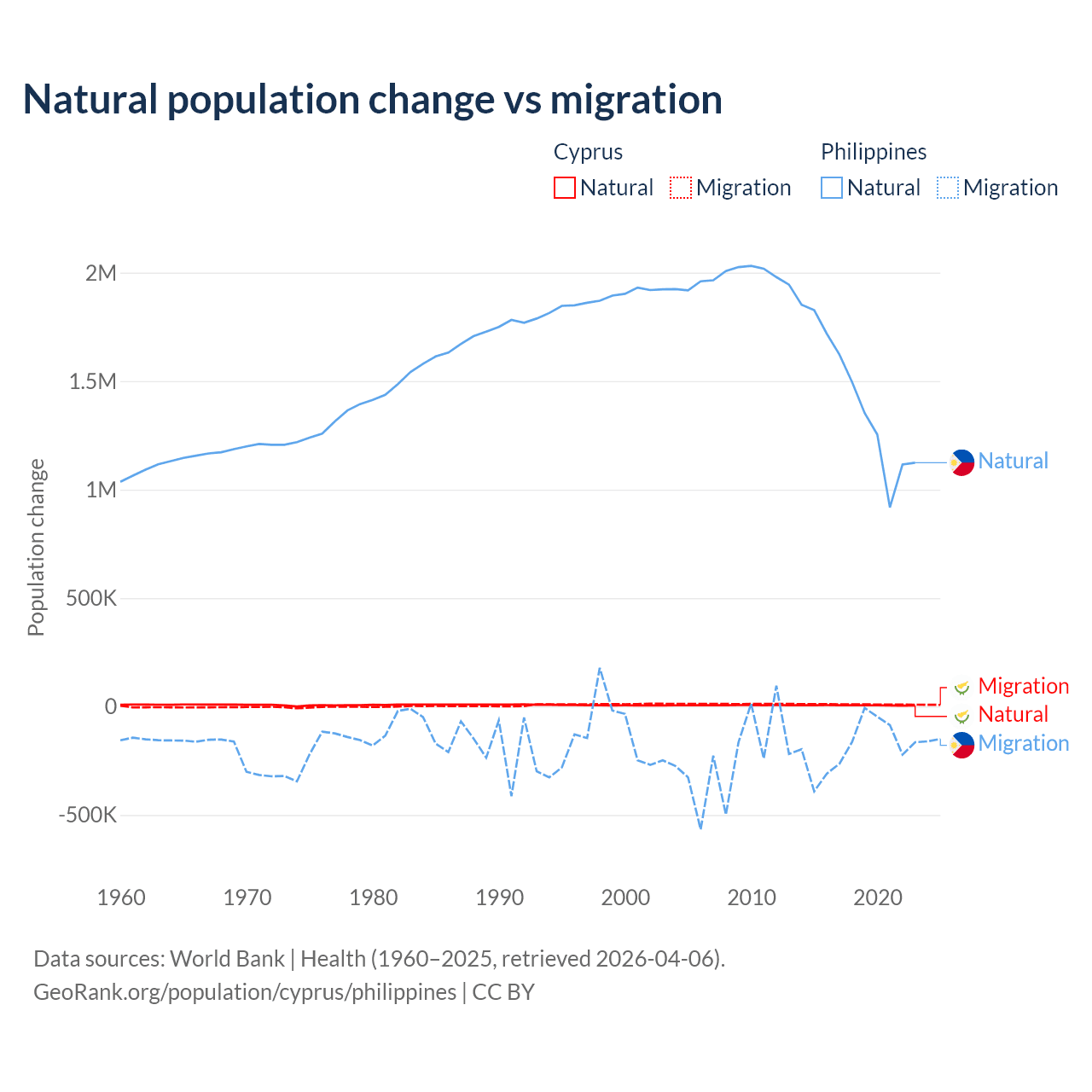 Over the last 10 years, 36.2% of the population change in Cyprus is from natural causes (a gain of 57,464 people) and 63.8% is from migration (a gain of 101,458 people). In the Philippines 88.5% is from natural causes (a gain of 14,279,705 people) and 11.5% is from migration (a loss of 1,848,117 people).