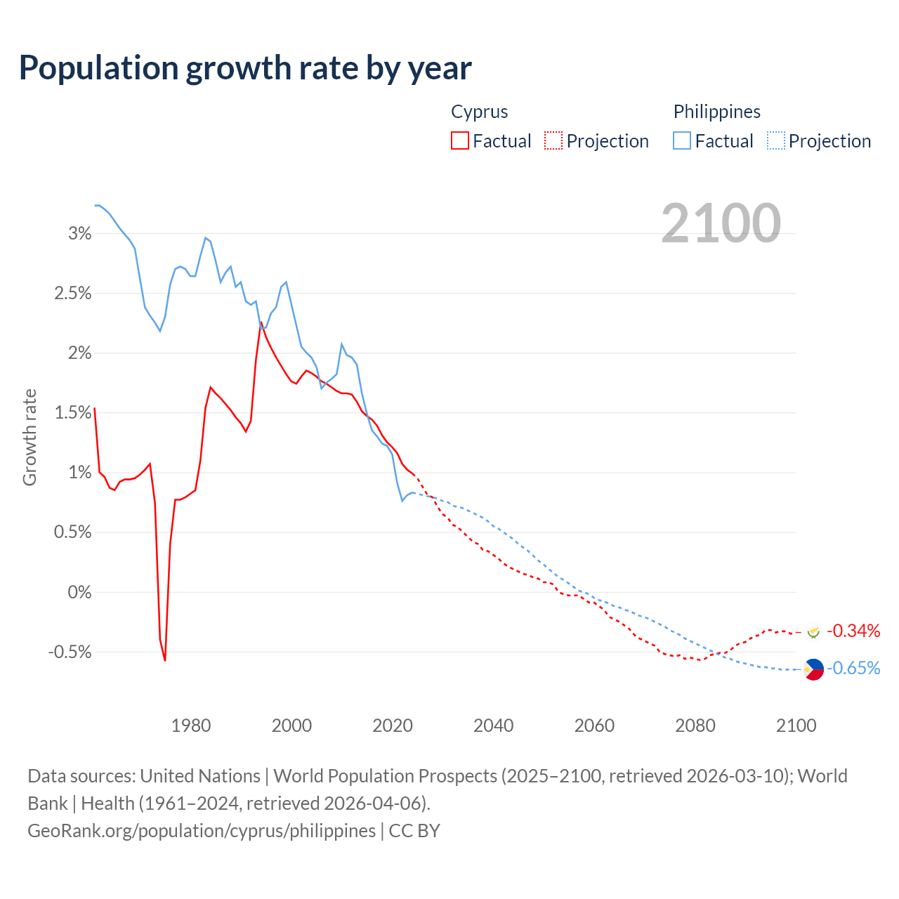 - For the last 10 years, Cyprus has had an average growth rate of +1.26% per year vs +1.16% in the Philippines.