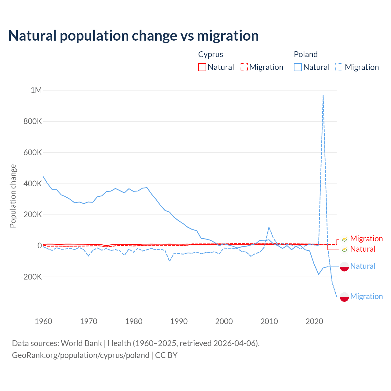 Over the last 10 years, 36.2% of the population change in Cyprus is from natural causes (a gain of 57,464 people) and 63.8% is from migration (a gain of 101,458 people). In Poland 41.4% is from natural causes (a loss of 675,443 people) and 58.6% is from migration (a gain of 955,766 people).