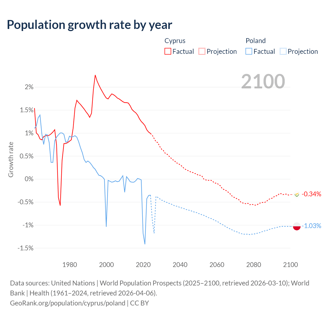 - For the last 10 years, Cyprus has had an average growth rate of +1.26% per year vs -0.36% in Poland.