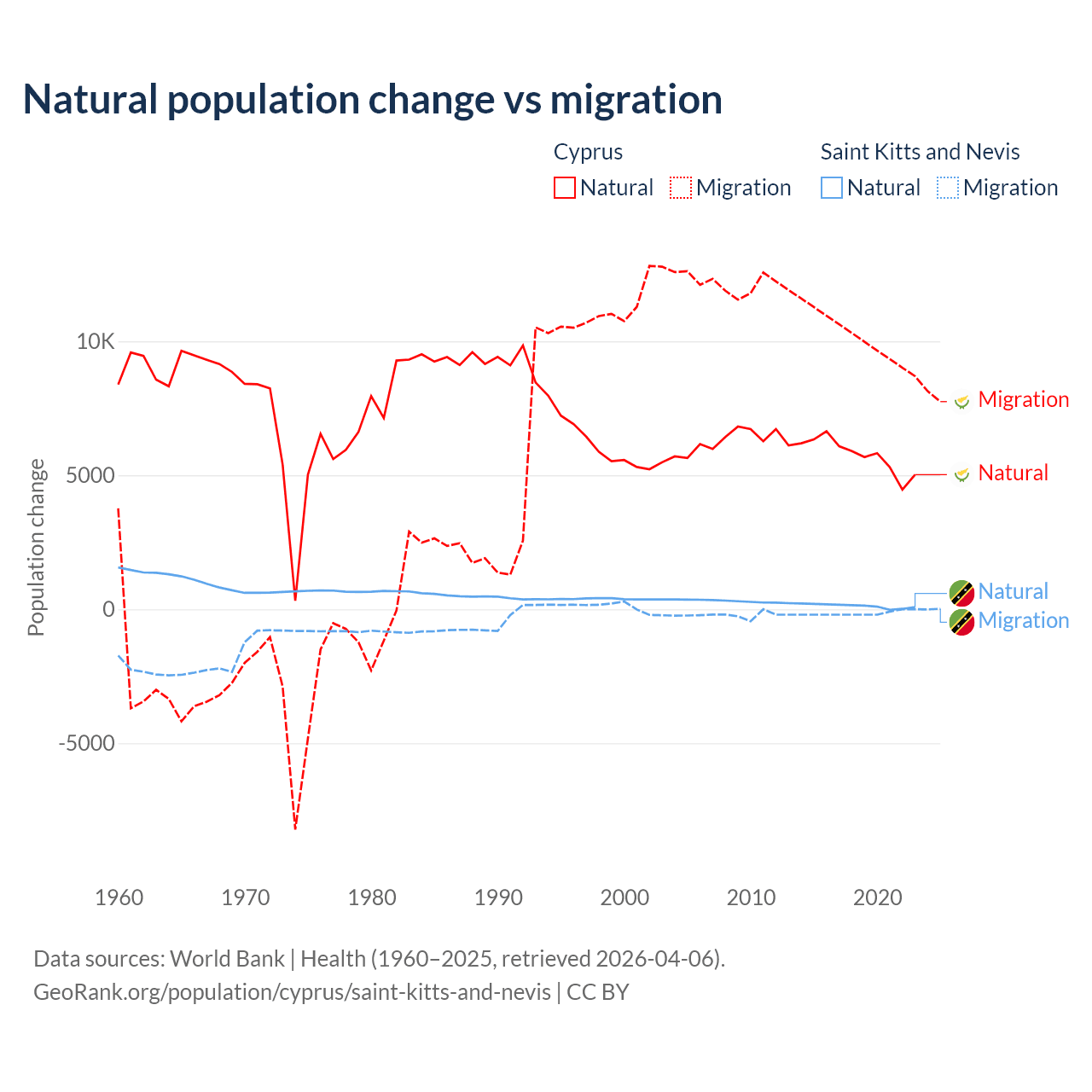 Over the last 10 years, 36.2% of the population change in Cyprus is from natural causes (a gain of 57,464 people) and 63.8% is from migration (a gain of 101,458 people). In Saint Kitts and Nevis 44.9% is from natural causes (a gain of 1,225 people) and 55.1% is from migration (a loss of 1,506 people).