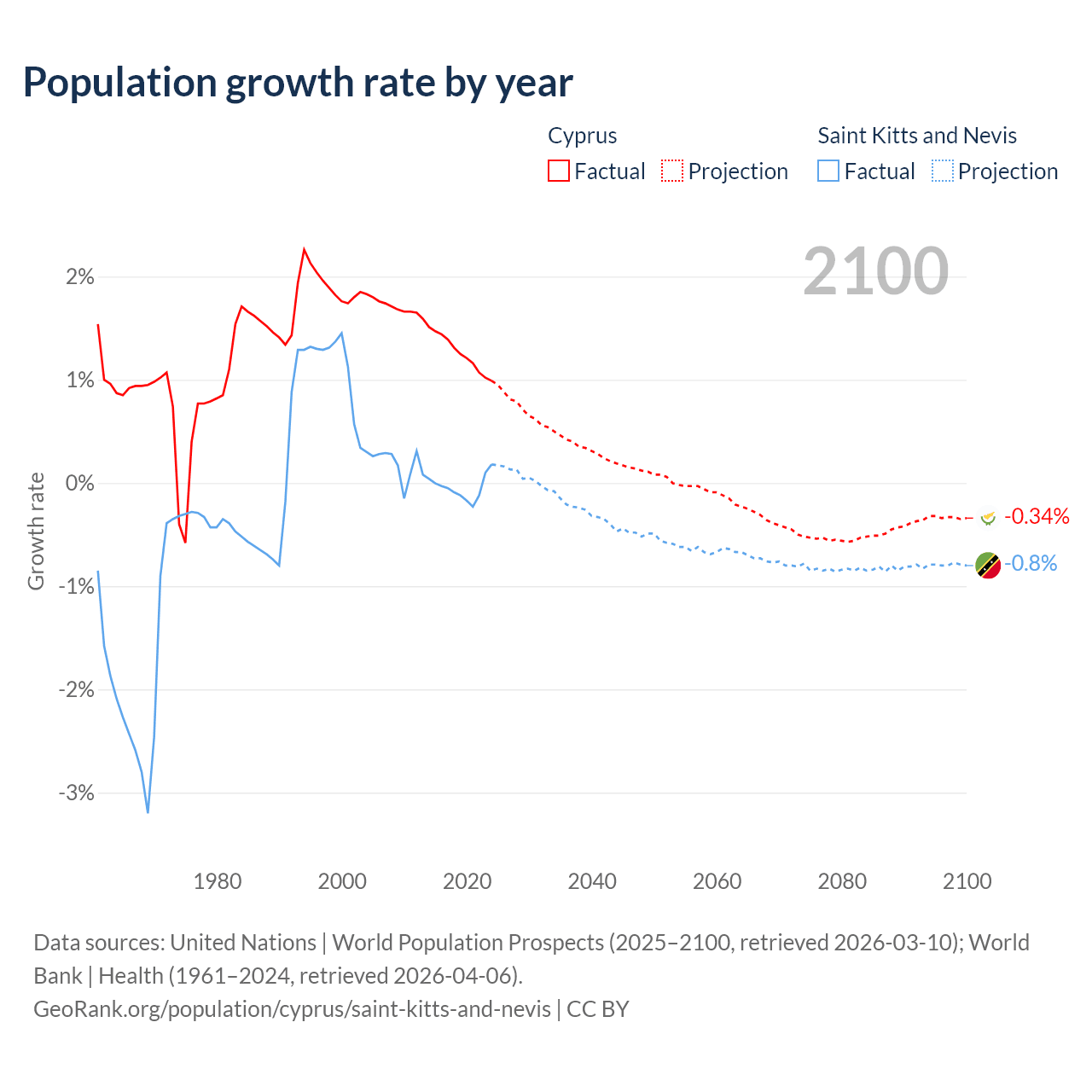 - For the last 10 years, Cyprus has had an average growth rate of +1.26% per year vs -0.04% in Saint Kitts and Nevis.