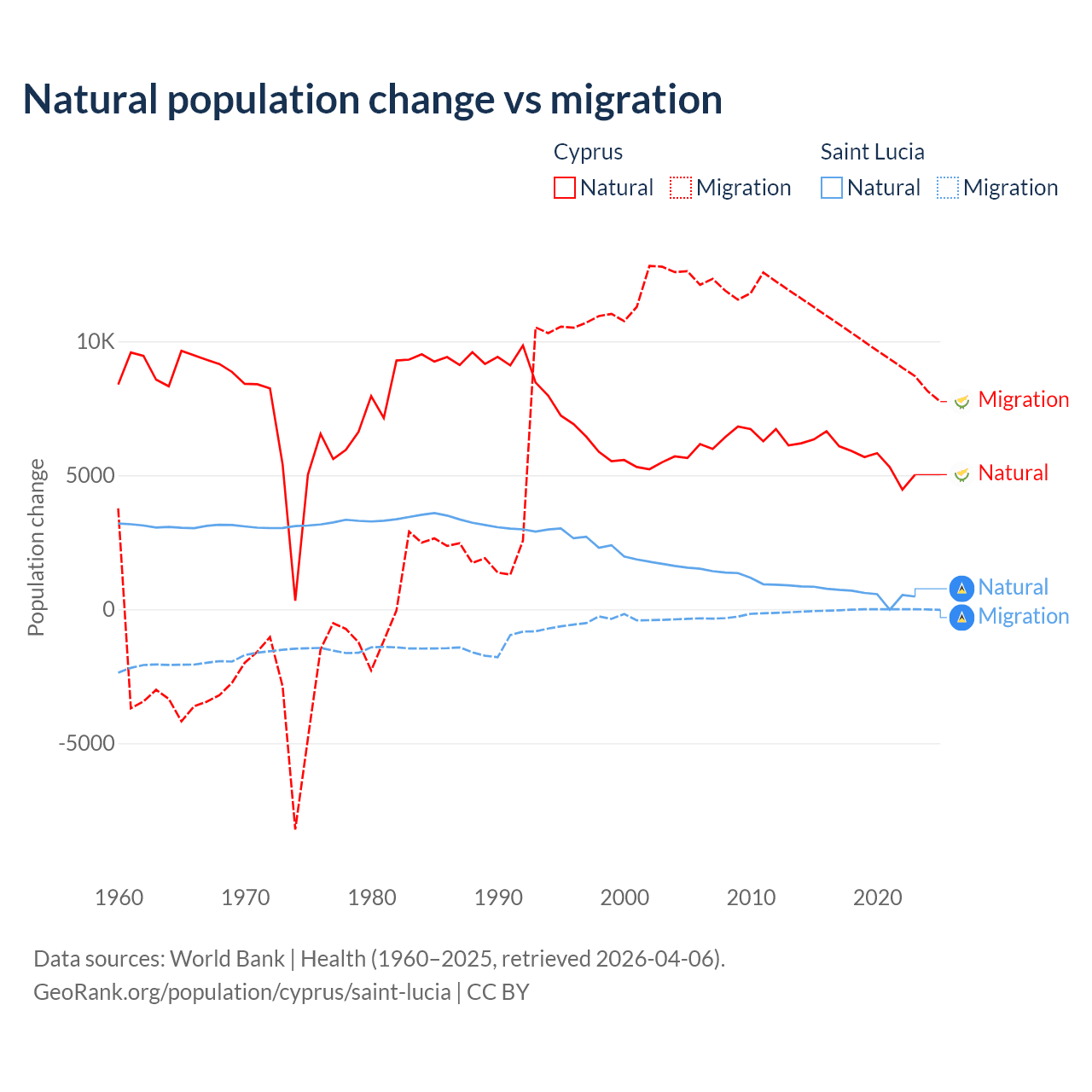 Over the last 10 years, 36.2% of the population change in Cyprus is from natural causes (a gain of 57,464 people) and 63.8% is from migration (a gain of 101,458 people). In Saint Lucia 95.7% is from natural causes (a gain of 6,039 people) and 4.31% is from migration (a loss of 272 people).