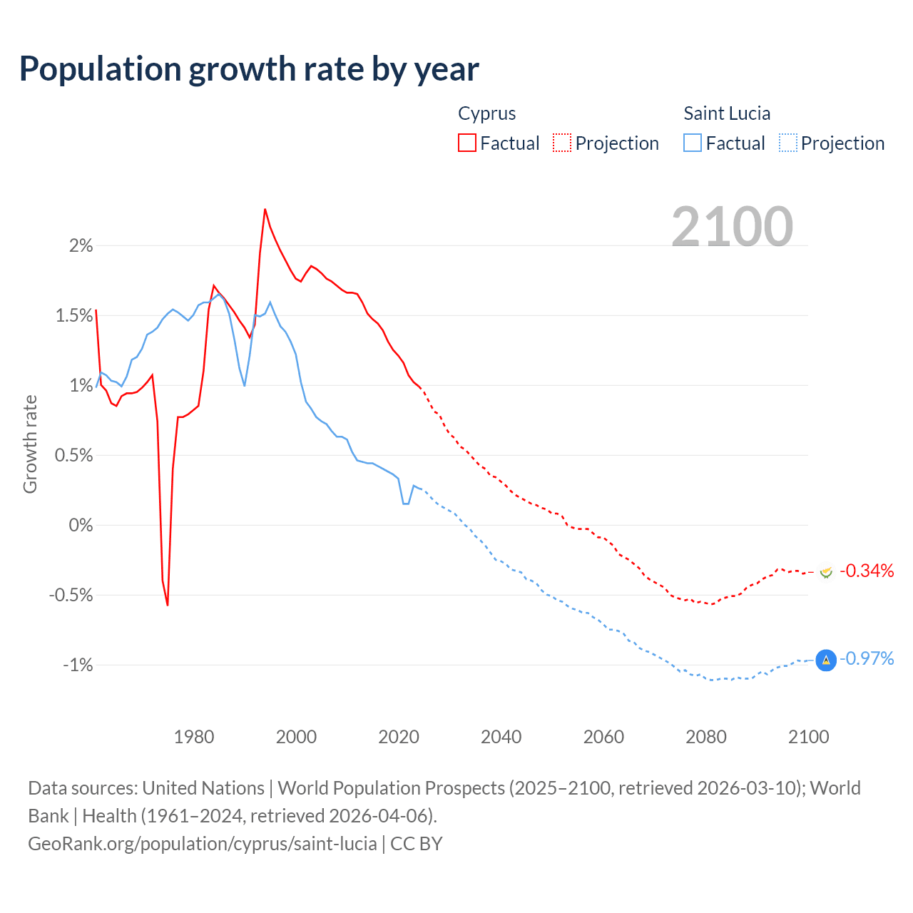 - For the last 10 years, Cyprus has had an average growth rate of +1.26% per year vs +0.33% in Saint Lucia.