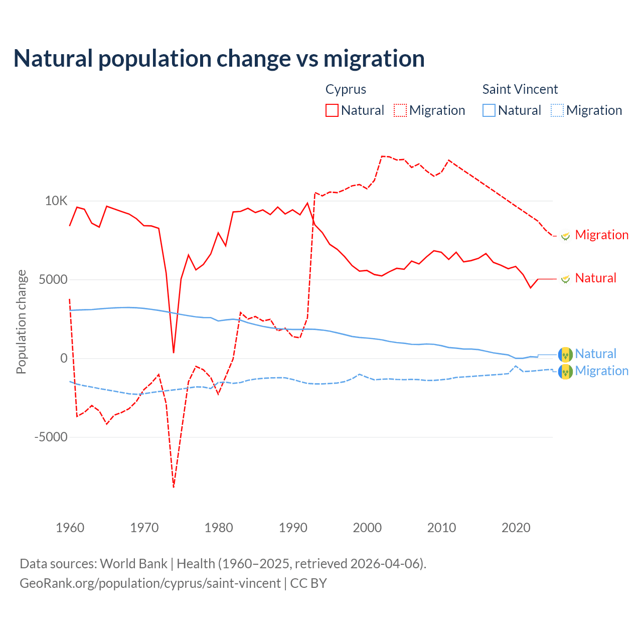 Over the last 10 years, 36.2% of the population change in Cyprus is from natural causes (a gain of 57,464 people) and 63.8% is from migration (a gain of 101,458 people). In Saint Vincent 21.2% is from natural causes (a gain of 2,525 people) and 78.8% is from migration (a loss of 9,393 people).
