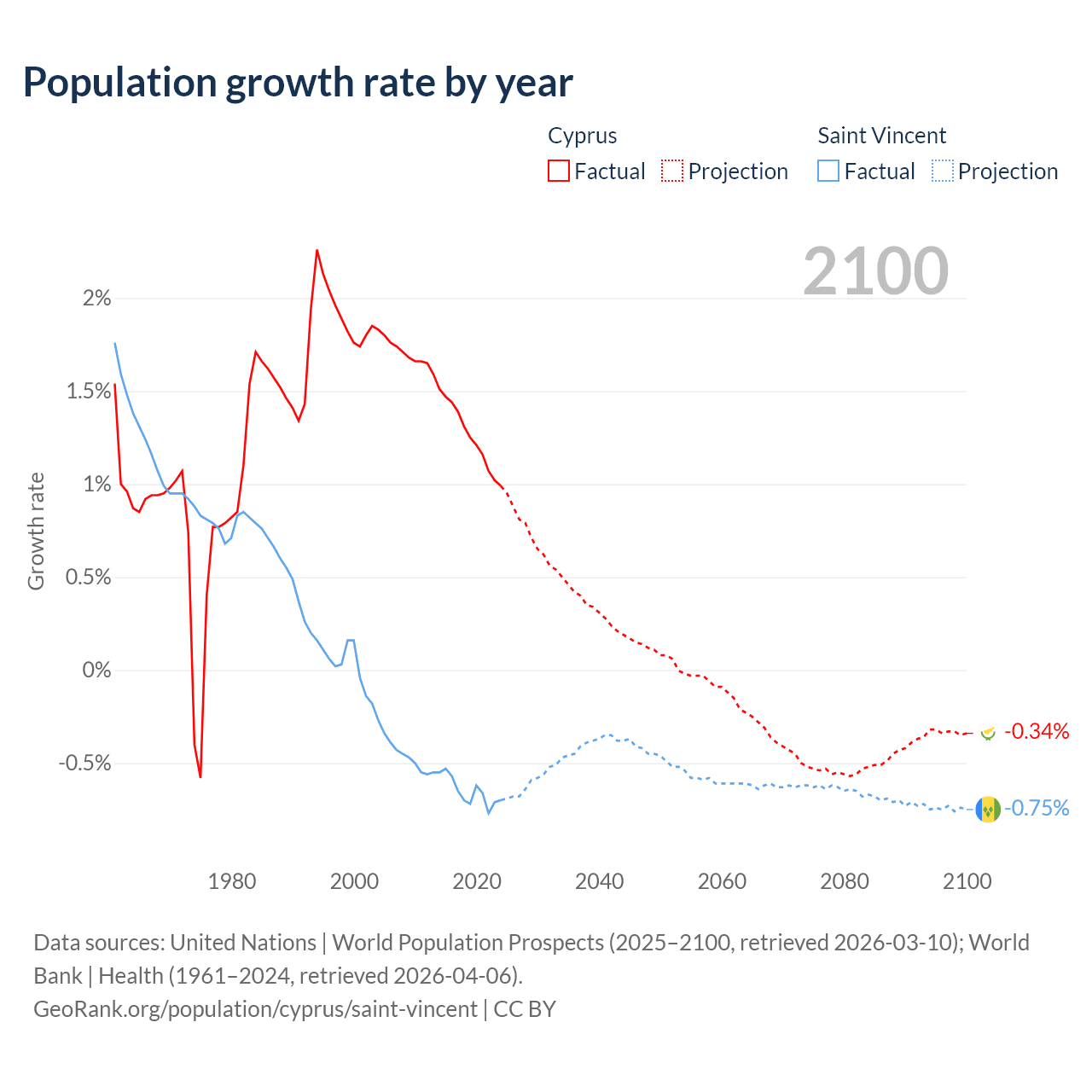 - For the last 10 years, Cyprus has had an average growth rate of +1.26% per year vs -0.65% in Saint Vincent.