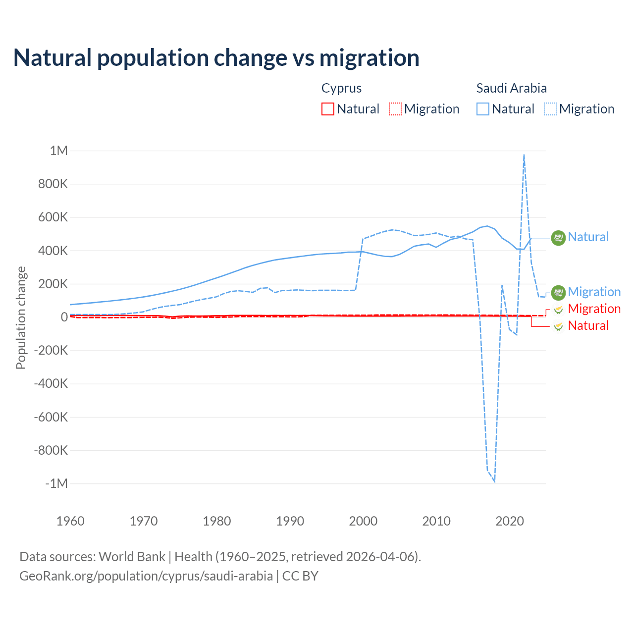 Over the last 10 years, 36.2% of the population change in Cyprus is from natural causes (a gain of 57,464 people) and 63.8% is from migration (a gain of 101,458 people). In Saudi Arabia 93.9% is from natural causes (a gain of 4,829,562 people) and 6.05% is from migration (a gain of 311,209 people).