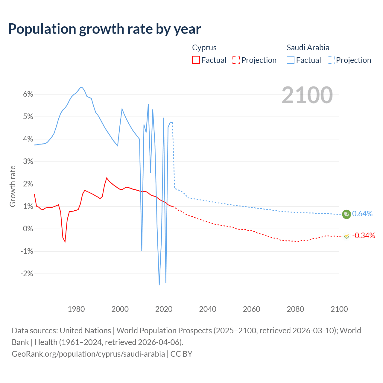 - For the last 10 years, Cyprus has had an average growth rate of +1.26% per year vs +2.3% in Saudi Arabia.