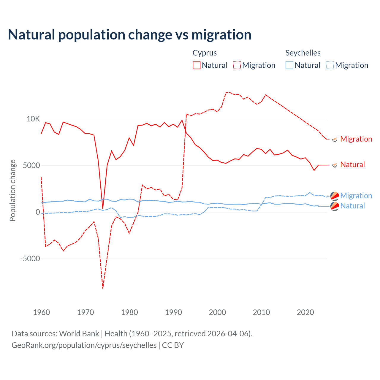 Over the last 10 years, 36.2% of the population change in Cyprus is from natural causes (a gain of 57,464 people) and 63.8% is from migration (a gain of 101,458 people). In the Seychelles 31.4% is from natural causes (a gain of 8,122 people) and 68.6% is from migration (a gain of 17,748 people).