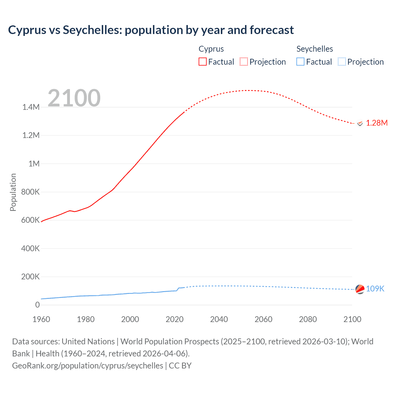 The latest officially reported population of Cyprus was 1,358,282 in 2024 vs 121,354 people in the Seychelles in 2024. In 2026, based on the adjusted UN estimation, the current Cyprus' population is 1,386,362 people compared to 126,311 in the Seychelles.