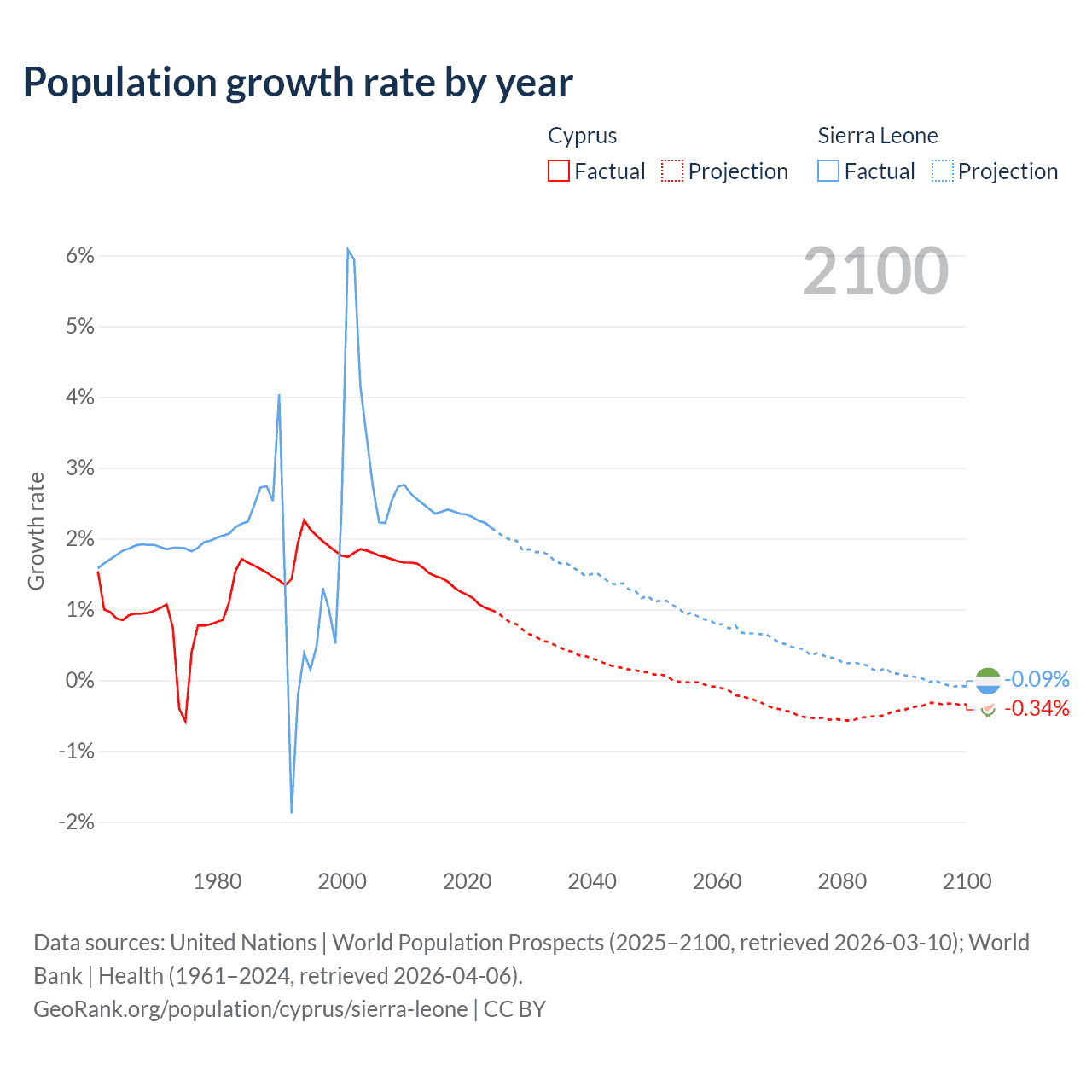 - For the last 10 years, Cyprus has had an average growth rate of +1.26% per year vs +2.32% in Sierra Leone.