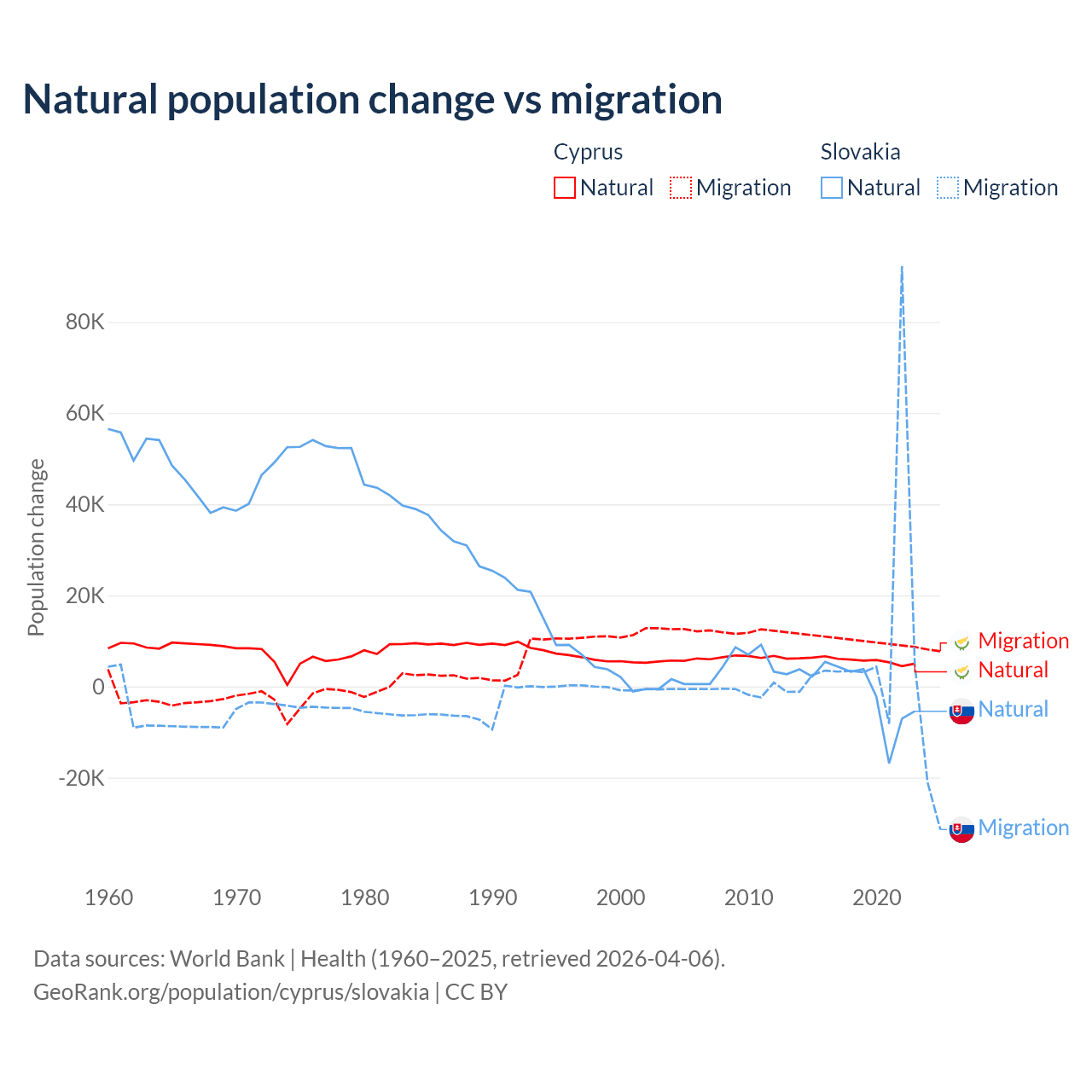 Over the last 10 years, 36.2% of the population change in Cyprus is from natural causes (a gain of 57,464 people) and 63.8% is from migration (a gain of 101,458 people). In Slovakia 7.47% is from natural causes (a loss of 8,728 people) and 92.5% is from migration (a gain of 108,156 people).
