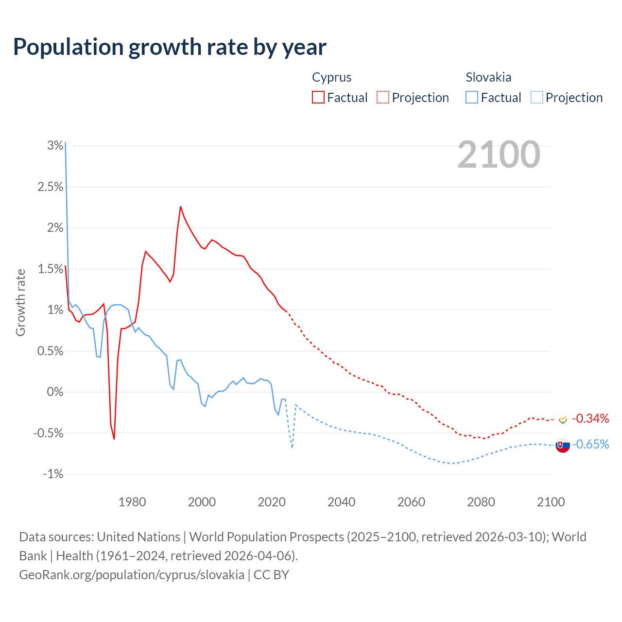 - For the last 10 years, Cyprus has had an average growth rate of +1.26% per year vs +0.01% in Slovakia.