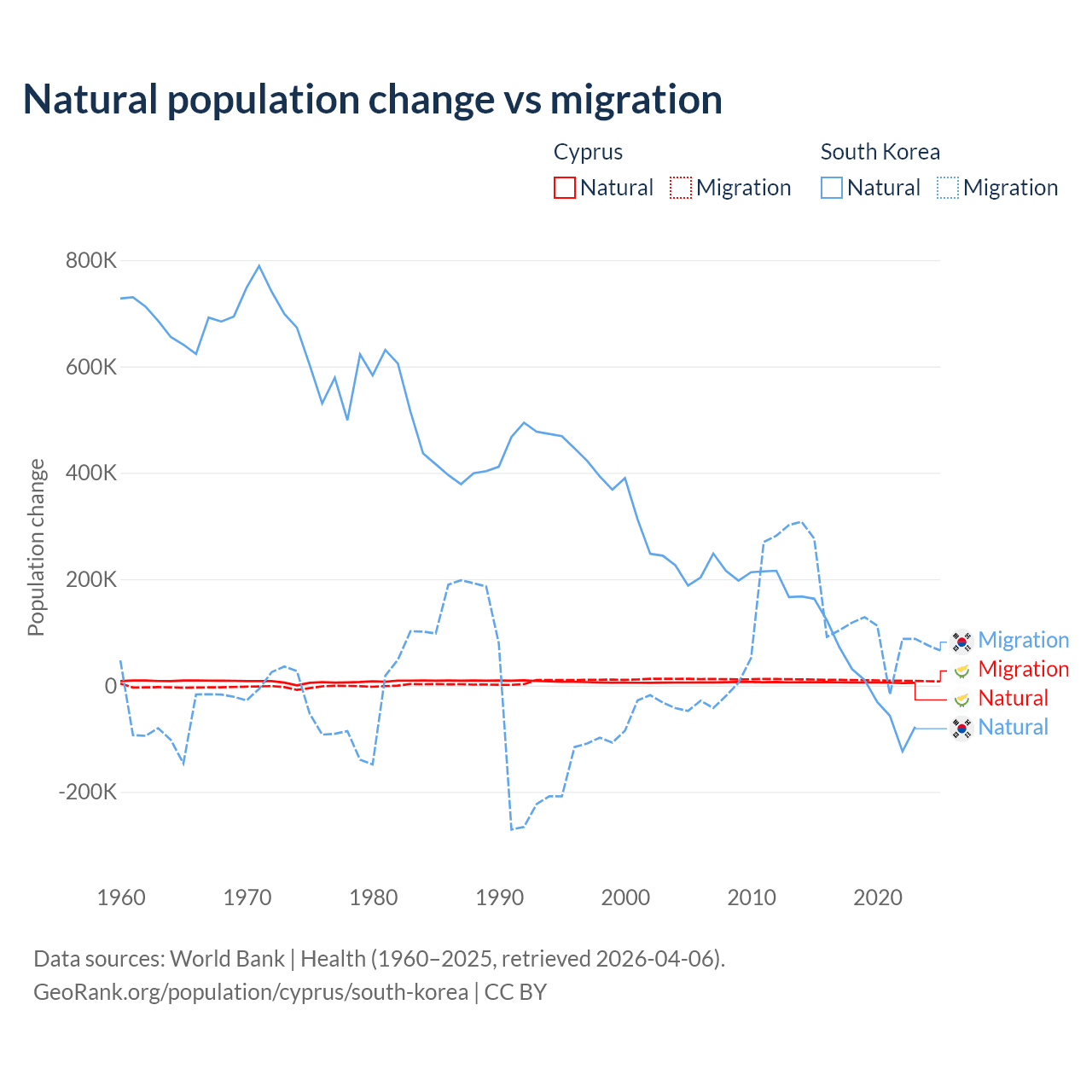 Over the last 10 years, 36.2% of the population change in Cyprus is from natural causes (a gain of 57,464 people) and 63.8% is from migration (a gain of 101,458 people). In South Korea 17.6% is from natural causes (a gain of 277,215 people) and 82.4% is from migration (a gain of 1,298,356 people).