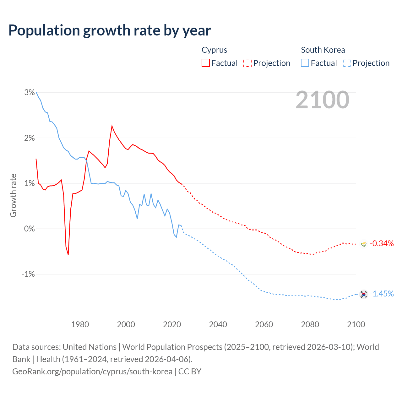 - For the last 10 years, Cyprus has had an average growth rate of +1.26% per year vs +0.24% in South Korea.