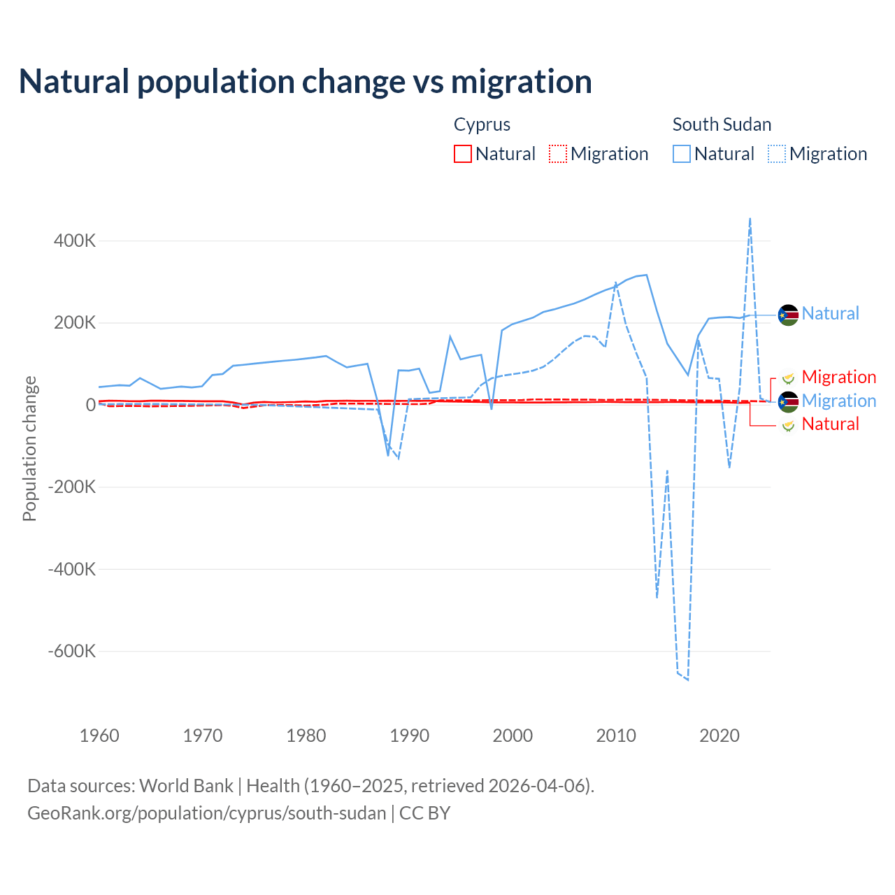 Over the last 10 years, 36.2% of the population change in Cyprus is from natural causes (a gain of 57,464 people) and 63.8% is from migration (a gain of 101,458 people). In South Sudan 57.4% is from natural causes (a gain of 1,792,135 people) and 42.6% is from migration (a loss of 1,329,606 people).