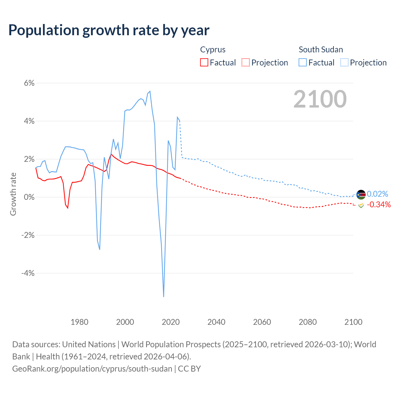- For the last 10 years, Cyprus has had an average growth rate of +1.26% per year vs +0.65% in South Sudan.