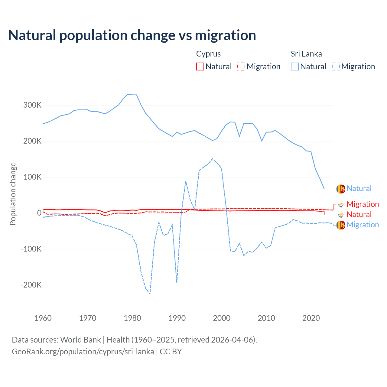 Over the last 10 years, 36.2% of the population change in Cyprus is from natural causes (a gain of 57,464 people) and 63.8% is from migration (a gain of 101,458 people). In Sri Lanka 85.3% is from natural causes (a gain of 1,605,749 people) and 14.7% is from migration (a loss of 276,121 people).