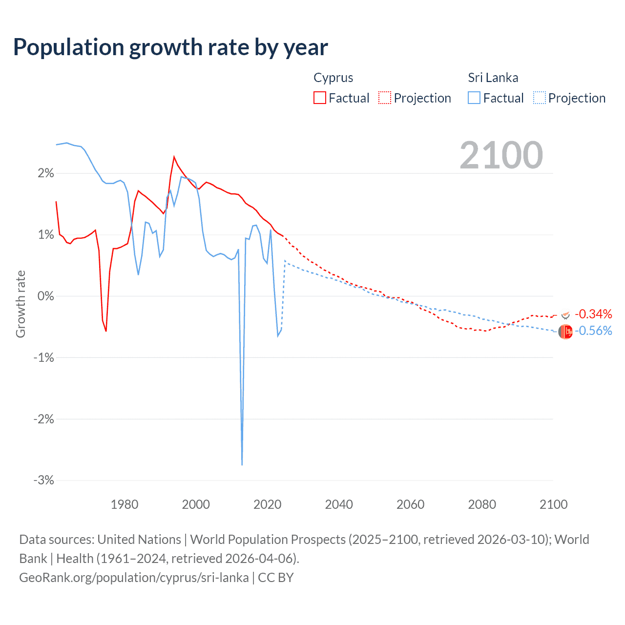 - For the last 10 years, Cyprus has had an average growth rate of +1.26% per year vs +0.57% in Sri Lanka.