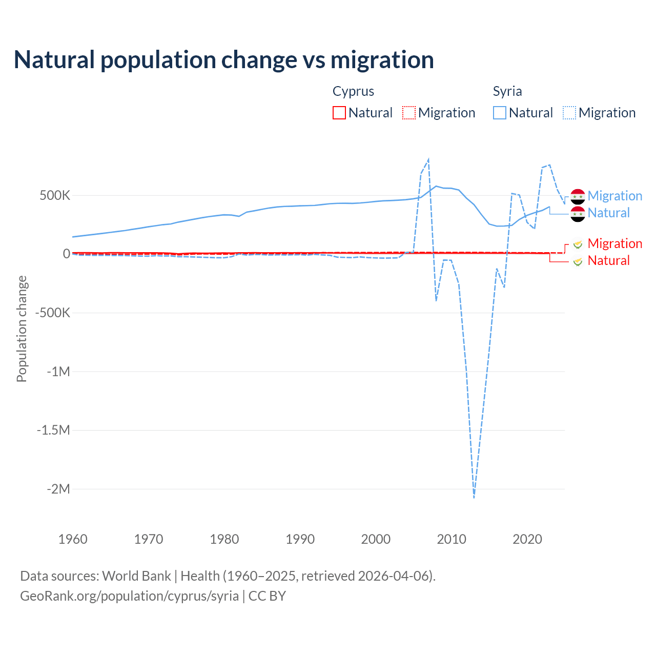 Over the last 10 years, 36.2% of the population change in Cyprus is from natural causes (a gain of 57,464 people) and 63.8% is from migration (a gain of 101,458 people). In Syria 91.3% is from natural causes (a gain of 3,047,621 people) and 8.72% is from migration (a gain of 291,069 people).