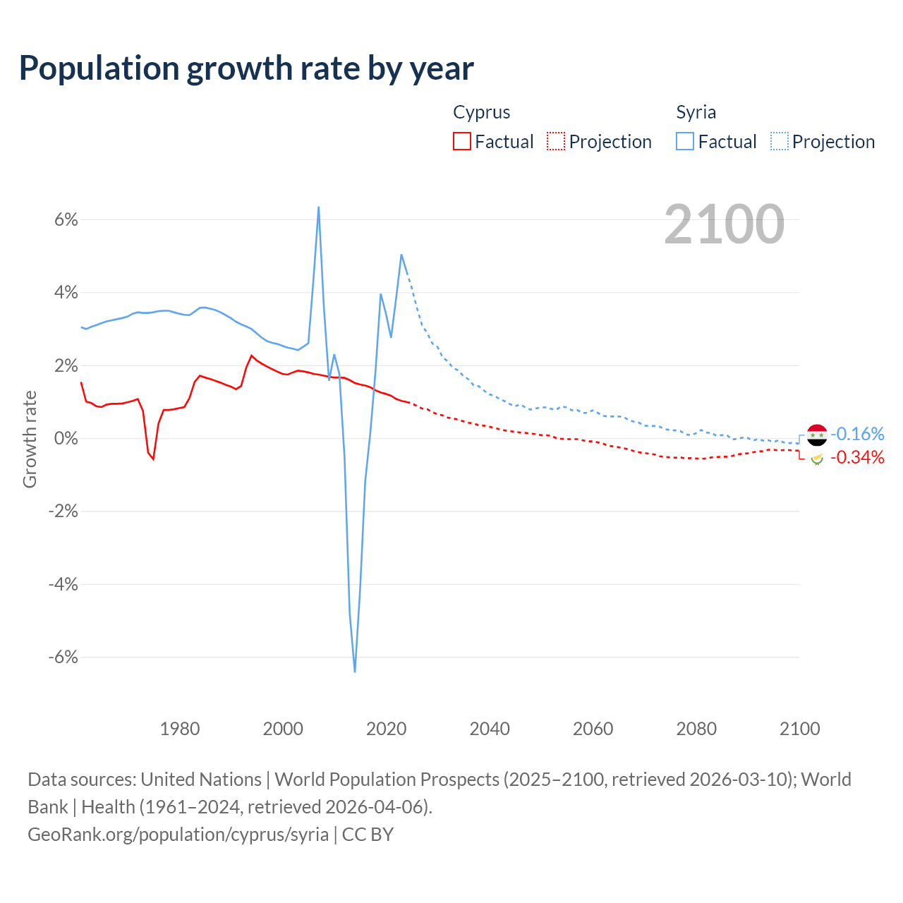 - For the last 10 years, Cyprus has had an average growth rate of +1.26% per year vs +1.25% in Syria.